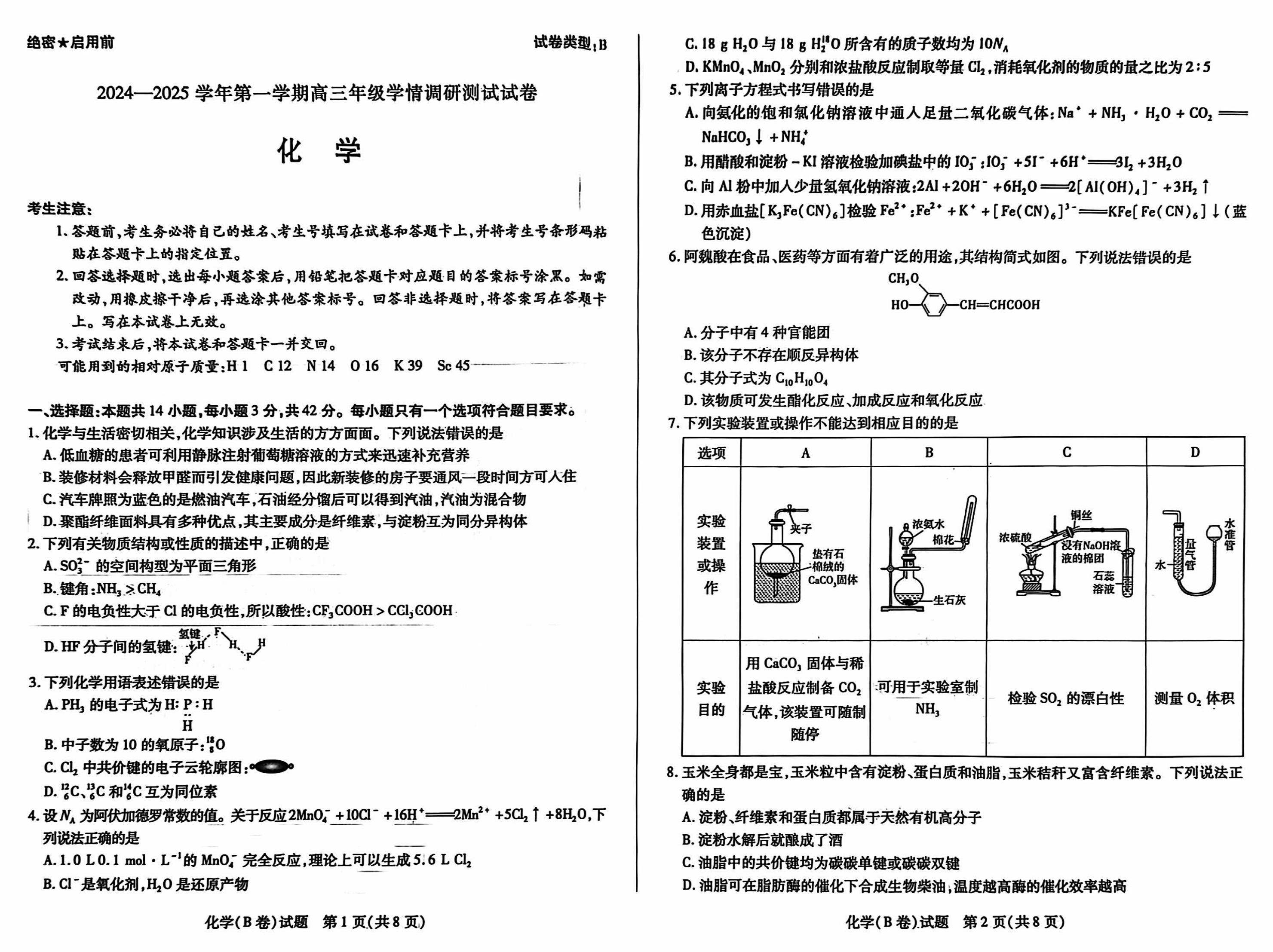 山西河南天一大联考2025届高三11月期中调研化学试题及答案