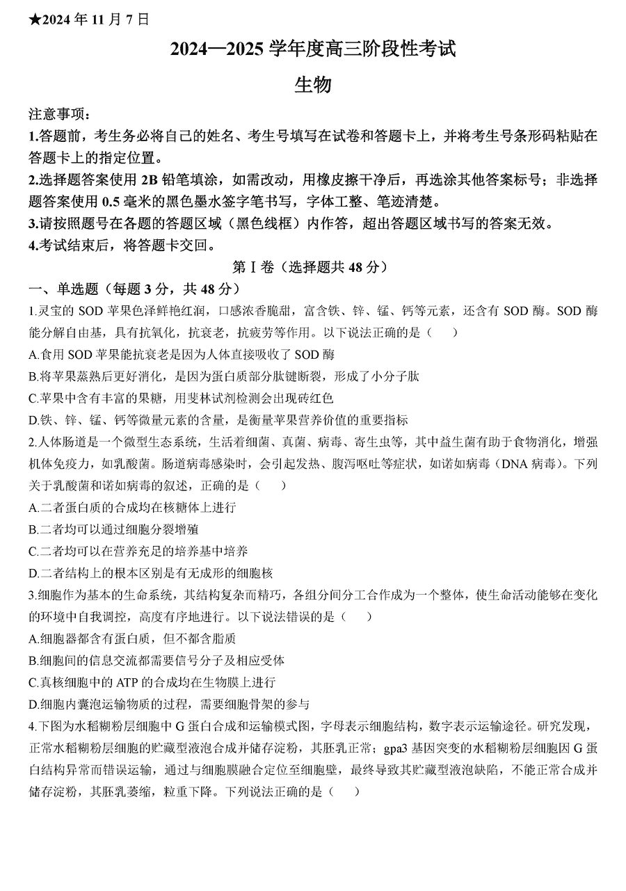 河南三门峡2024-2025学年高三上学期11月期中生物试题及答案