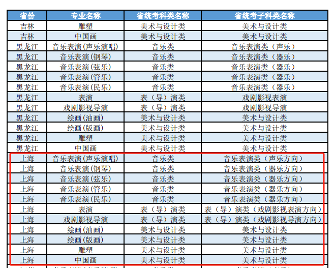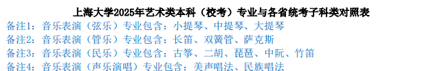 上海大学2025年艺术类本科(校考)专业与各省统考子科类对照表