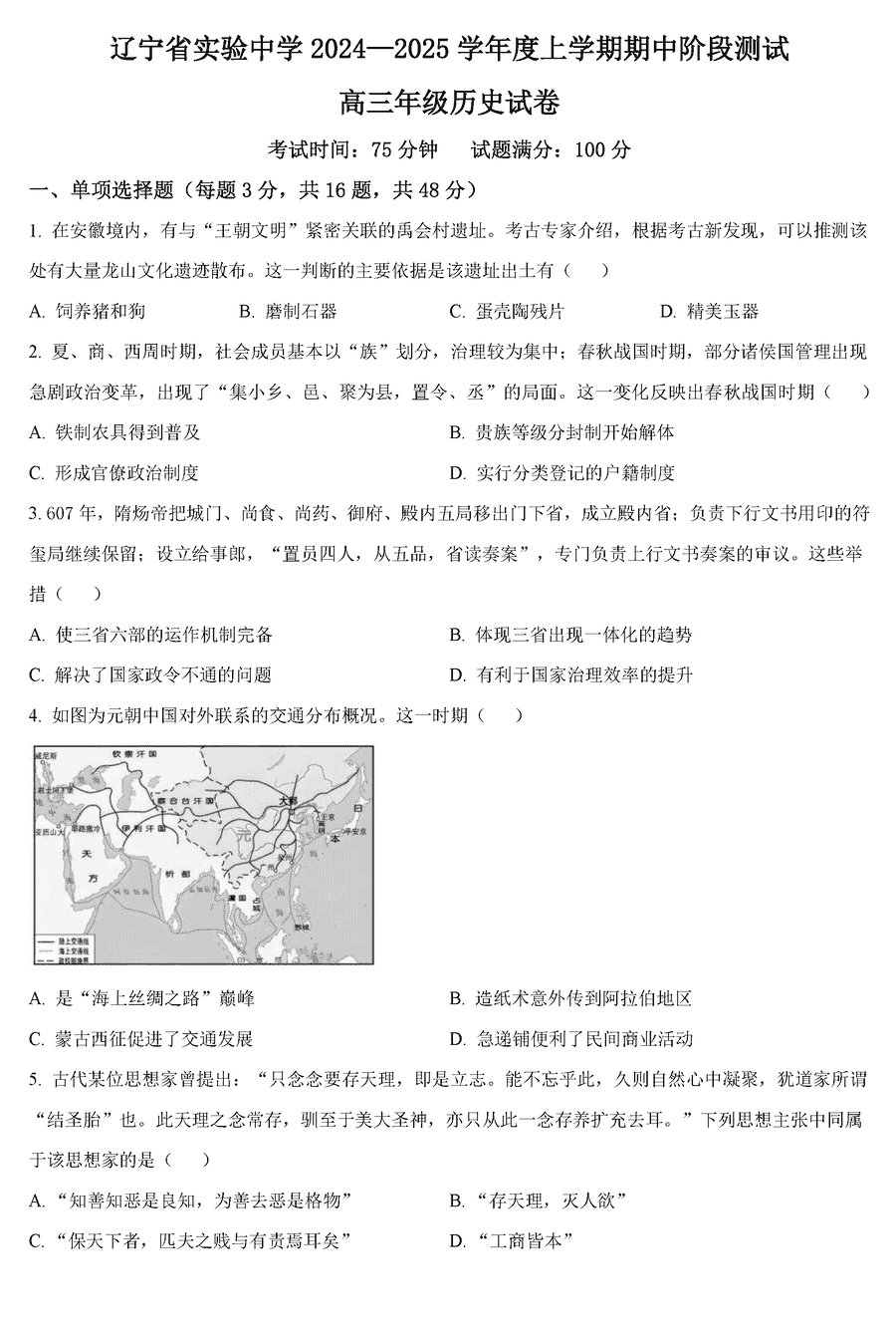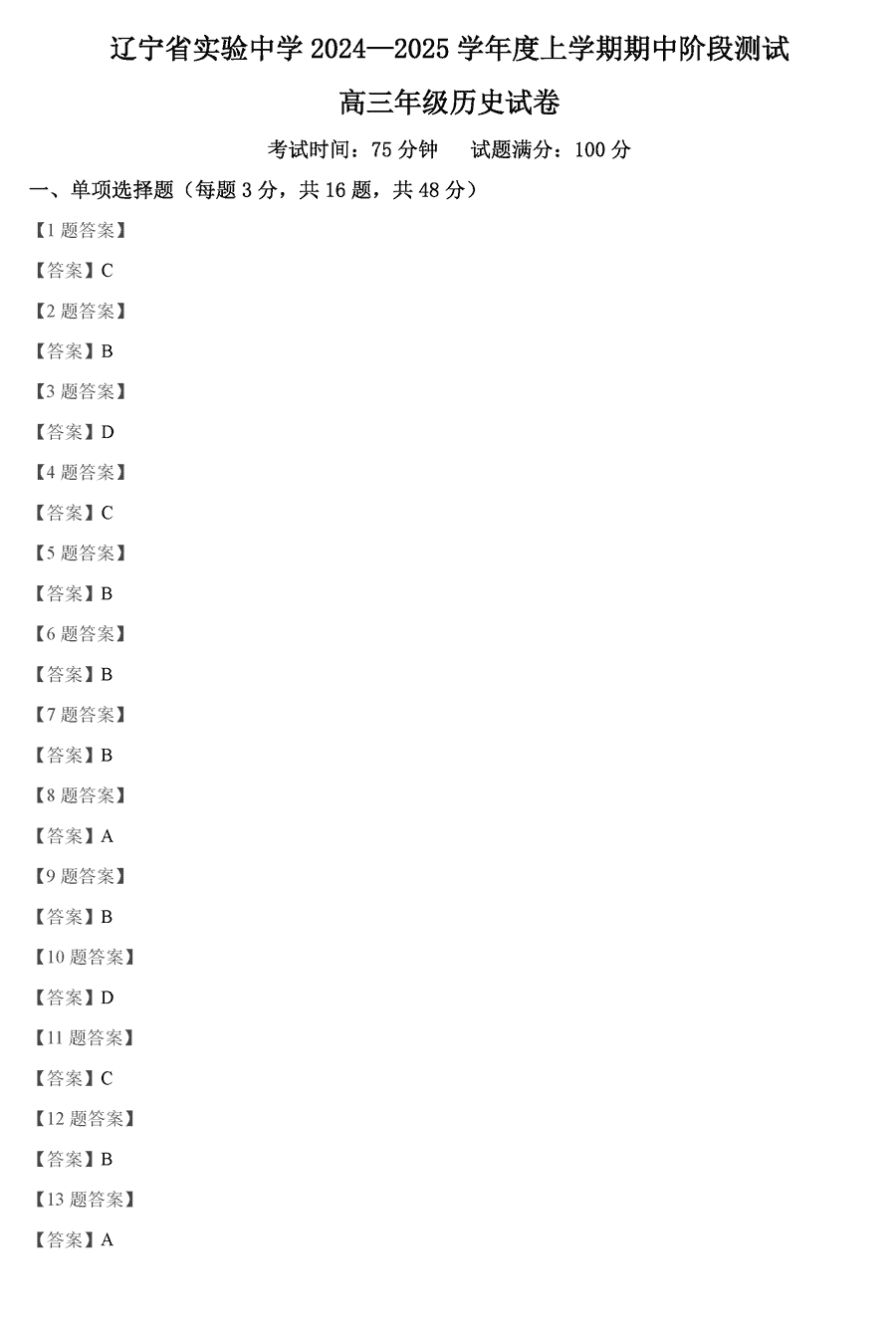 辽宁省实验中学2024-2025学年高三上学期期中历史考试已于近日开考,为方便考生考后及时查看考试情况,查漏补缺、弥补不足,本文整理了试题答案解析相关信息!