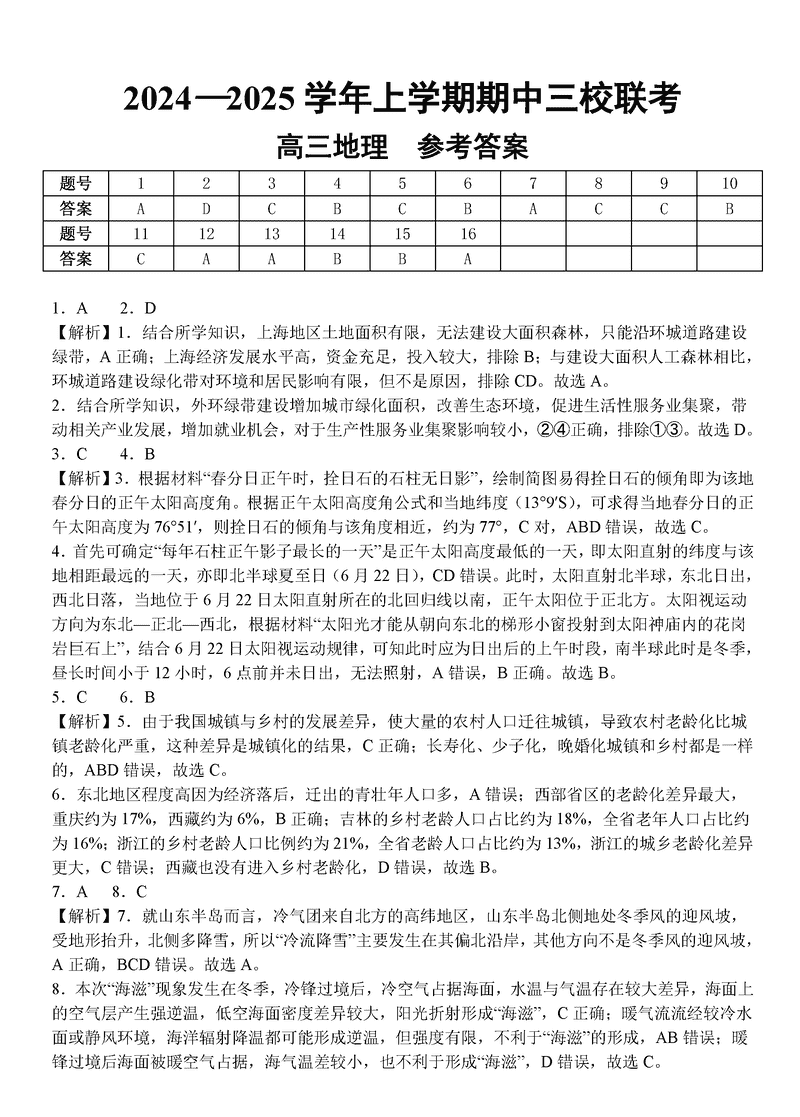 广州三校2024-2025学年高三上学期期中联考地理试题及答案