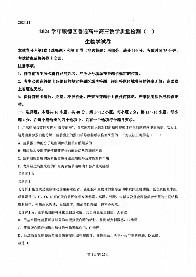 佛山顺德区2024学年高三教学质检(一)生物考试已于近日开考,为方便考生考后及时查看考试情况,查漏补缺、弥补不足,本文整理了试题答案解析相关信息!