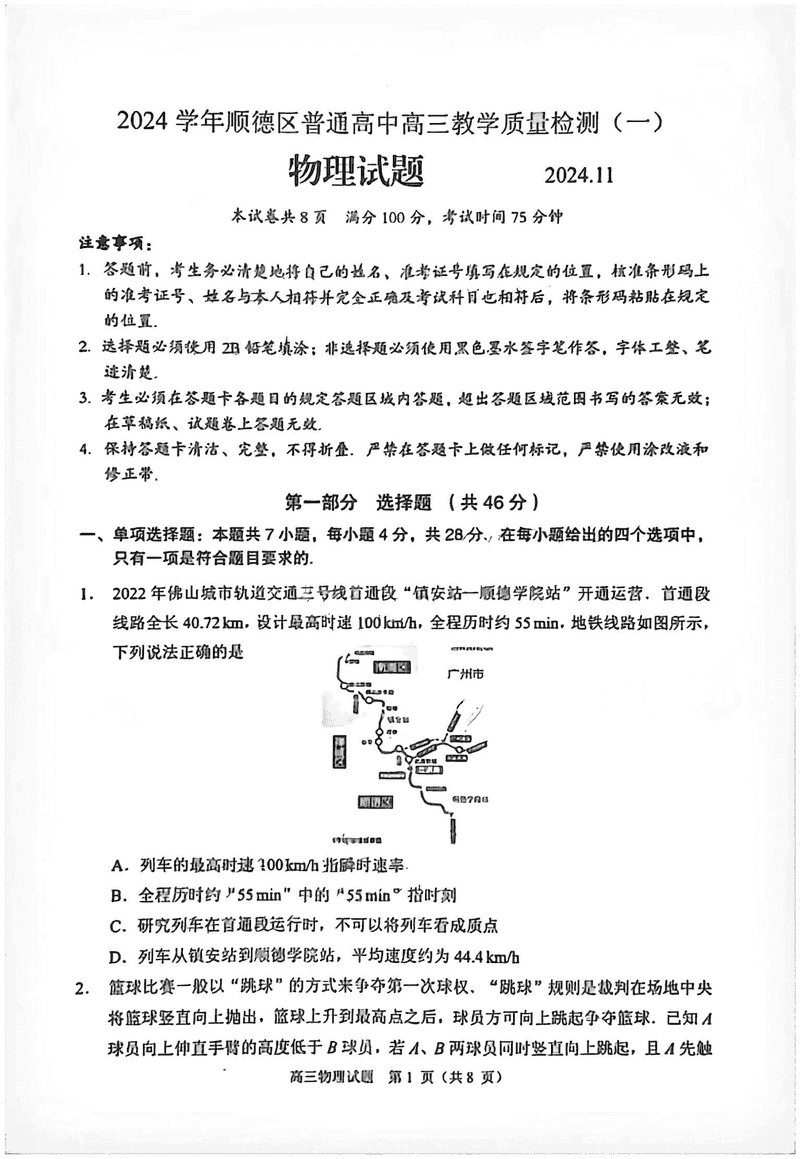 佛山顺德区2024学年高三教学质检(一)物理试题及答案