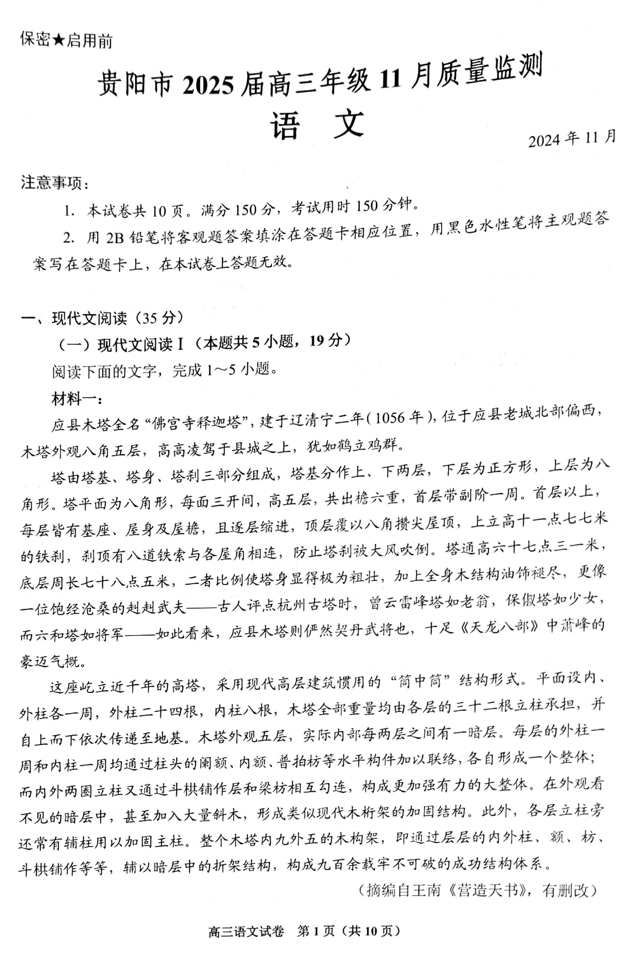 贵阳市2025届高三上学期11月质量监测语文考试已于近日开考,为方便考生考后及时查看考试情况,查漏补缺、弥补不足,本文整理了试题答案解析相关信息!