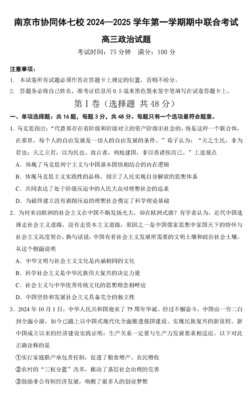 南京协同体七校2025届高三期中联考政治试题及答案 时间:2024-12-02 17:34 江苏 文综试题 南京协同体七校2025届高三期中联考政治考试已于近日开考,为方便考生考后及时查看考试情况,查漏补缺、弥补不足,本文整理了试题答案解析相关信息! 汇总:南京协同体七校2025届高三期中联考试题及答案汇总 政治试题及答案解析