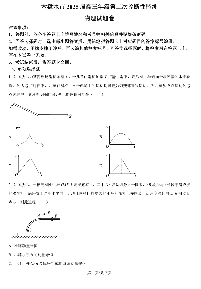六盘水2025届高三上学期第二次诊断物理试题及答案