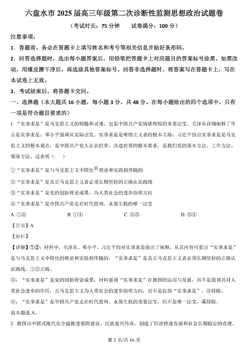 六盘水2025届高三上学期第二次诊断政治考试已于近日开考,为方便考生考后及时查看考试情况,查漏补缺、弥补不足,本文整理了试题答案解析相关信息!