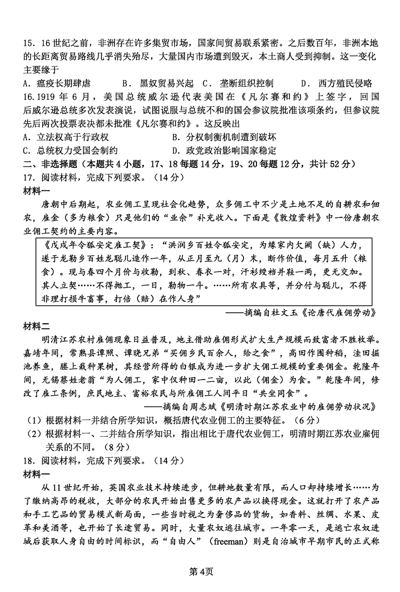 陕西宝鸡中学2025届高三12月月考三历史试题及答案