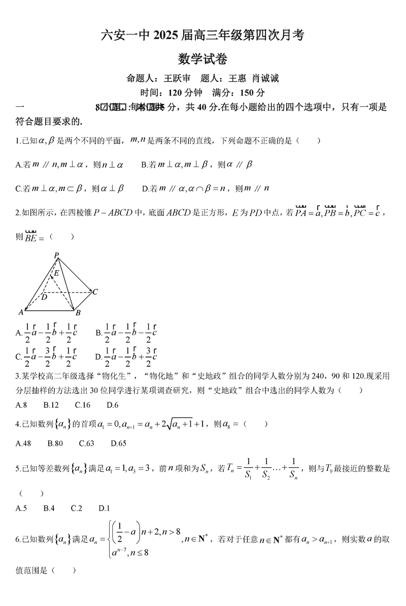 六安一中2025届高三第四次月考数学考试已于近日开考,为方便考生考后及时查看考试情况,查漏补缺、弥补不足,本文整理了试题答案解析相关信息!