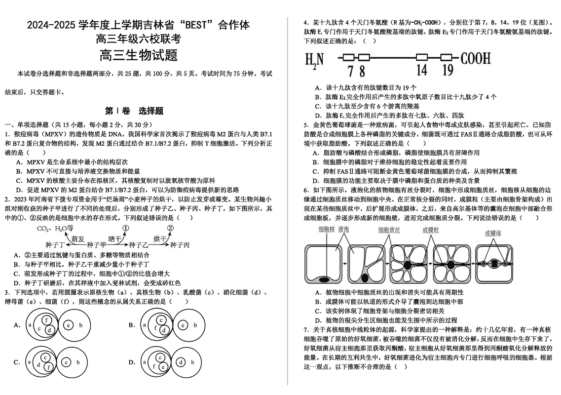吉林BEST合作体六校2025届高三上学期第三次联考生物考试已于近日开考,为方便考生考后及时查看考试情况,查漏补缺、弥补不足,本文整理了试题答案解析相关信息!