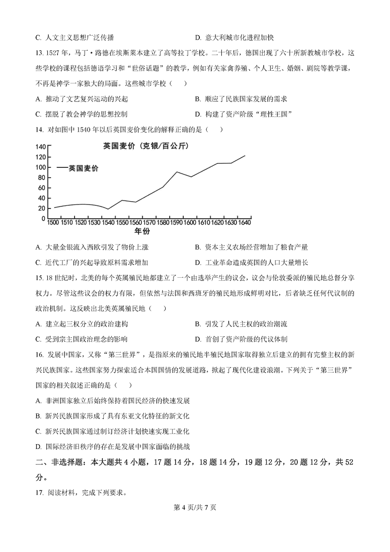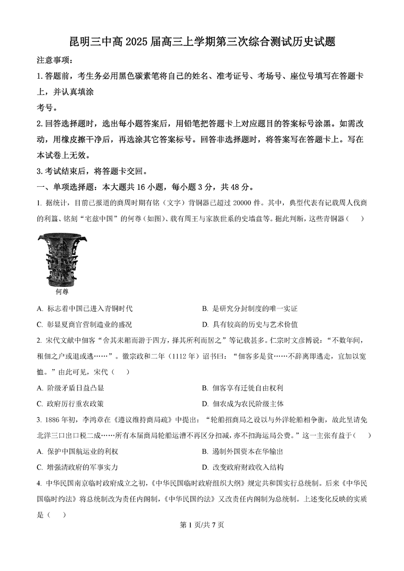 昆明三中2024-2025学年高三上学期11月月考历史试题及答案