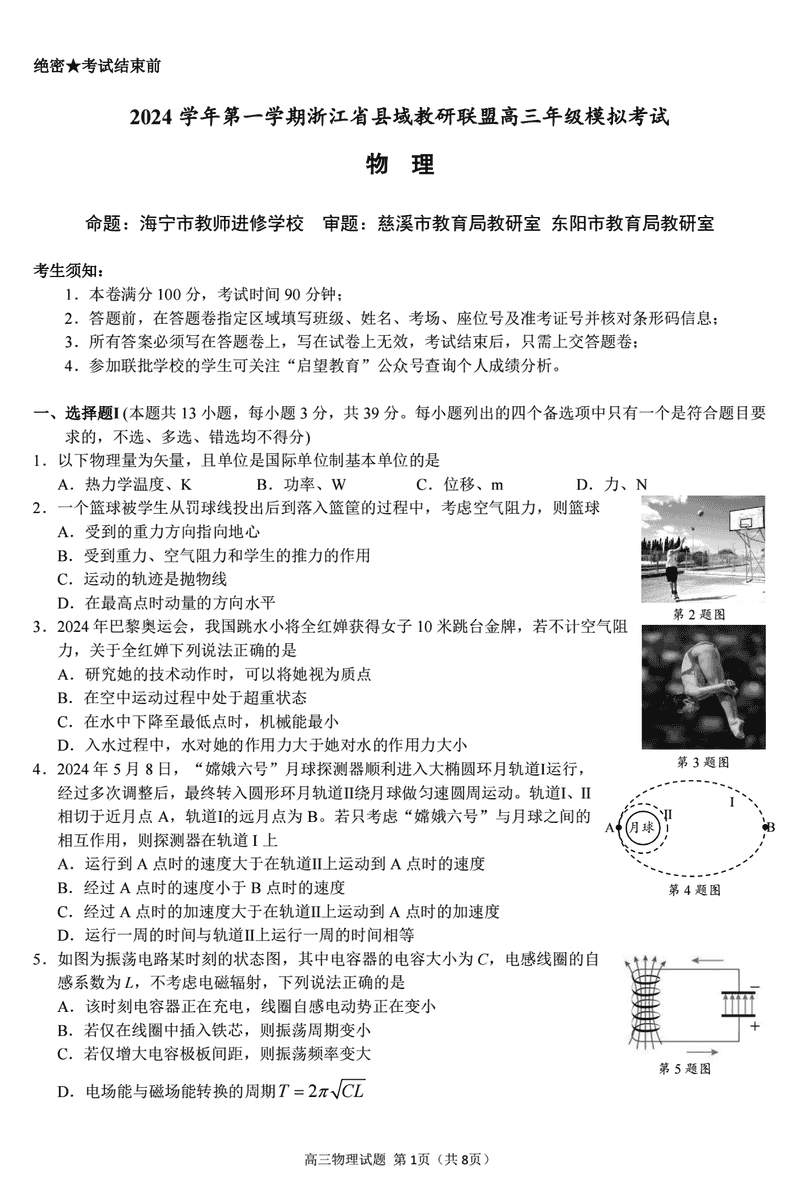 浙江县域教研联盟2025届高三上学期摸底考物理考试已于近日开考,为方便考生考后及时查看考试情况,查漏补缺、弥补不足,本文整理了试题答案解析相关信息!