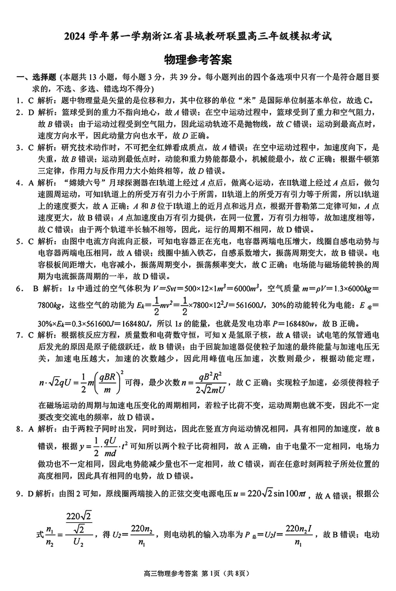 浙江县域教研联盟2025届高三上学期摸底考物理试题及答案