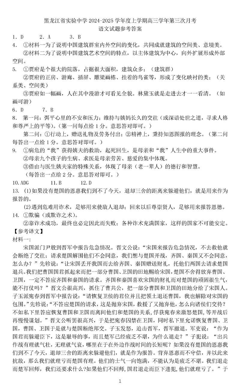 黑龙江省实验中学2025届高三上第三次月考语文考试已于近日开考,为方便考生考后及时查看考试情况,查漏补缺、弥补不足,本文整理了试题答案解析相关信息!