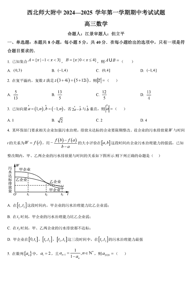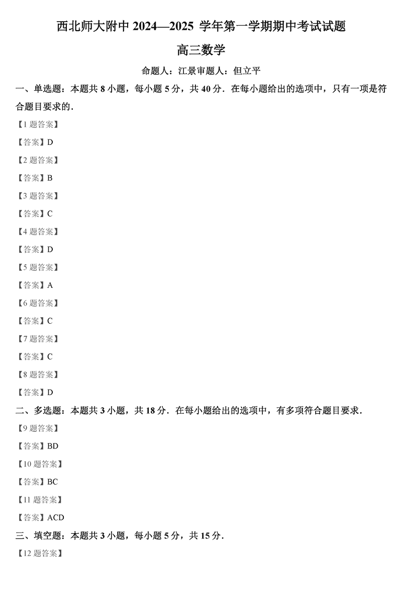 西北师大附中2024-2025学年高三上学期期中数学考试已于近日开考,为方便考生考后及时查看考试情况,查漏补缺、弥补不足,本文整理了试题答案解析相关信息!