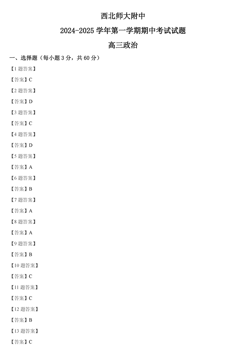 西北师大附中2024-2025学年高三上学期期中政治考试已于近日开考,为方便考生考后及时查看考试情况,查漏补缺、弥补不足,本文整理了试题答案解析相关信息!