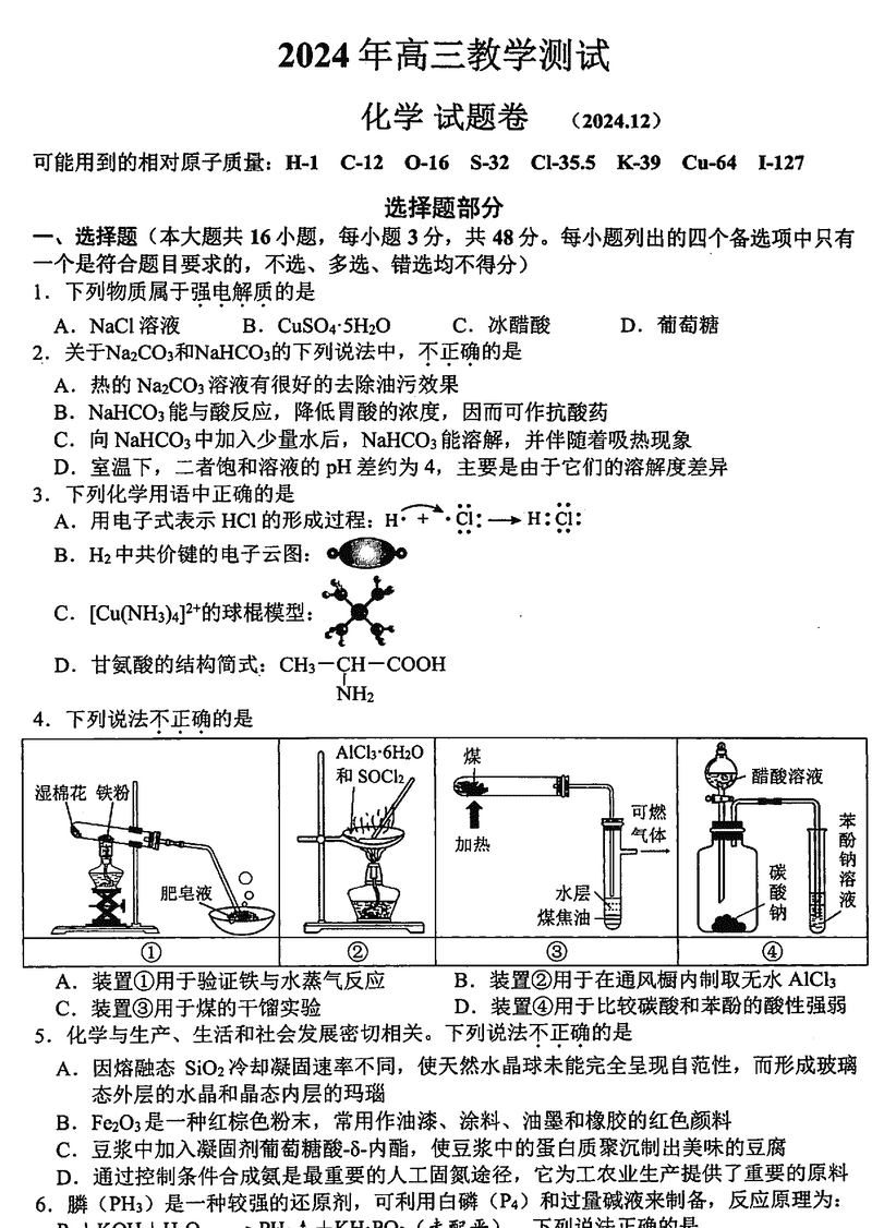 浙江嘉兴一模2024年高三12月教学测试化学试题及答案