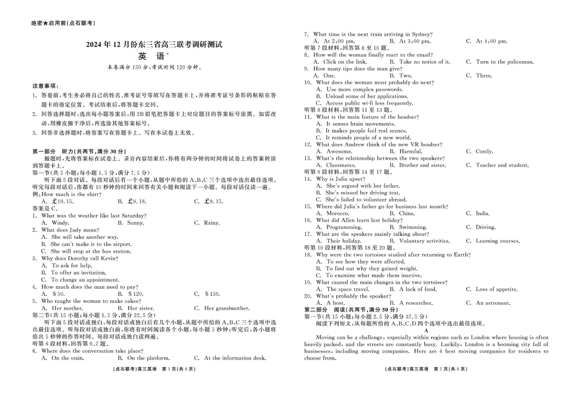 东北三省2024年12月高三点石联考英语试题及答案 时间:2024-12-13 11:16 黑龙江 英语试题 东北三省2024年12月高三点石联考英语考试已于近日开考,为方便考生考后及时查看考试情况,查漏补缺、弥补不足,本文整理了试题答案解析相关信息! 汇总:东北三省2024年12月高三点石联考调研测试试题及答案汇总 英语试题及答案解析