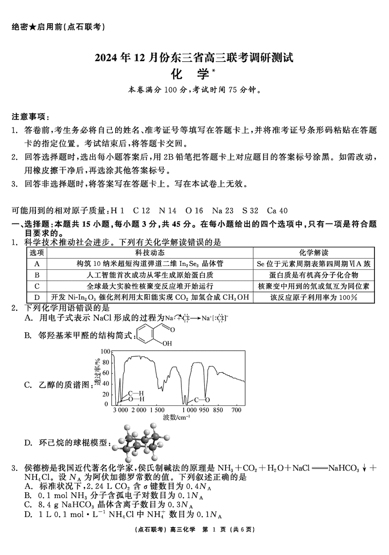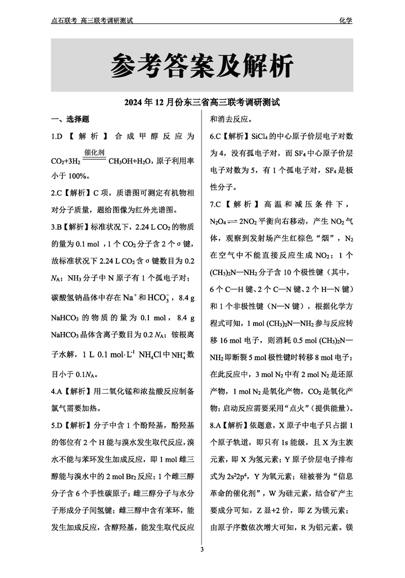 东北三省2024年12月高三点石联考化学试题及答案 时间:2024-12-13 11:16 黑龙江 理综试题 东北三省2024年12月高三点石联考化学考试已于近日开考,为方便考生考后及时查看考试情况,查漏补缺、弥补不足,本文整理了试题答案解析相关信息! 汇总:东北三省2024年12月高三点石联考调研测试试题及答案汇总 化学试题及答案解析