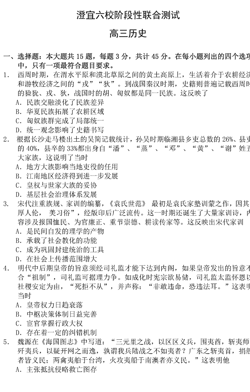 无锡澄宜六校2025届高三上学期12月联考历史试题及答案