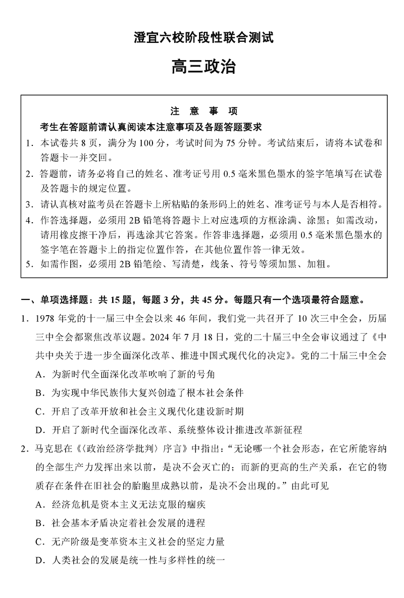 无锡澄宜六校2025届高三上学期12月联考政治考试已于近日开考,为方便考生考后及时查看考试情况,查漏补缺、弥补不足,本文整理了试题答案解析相关信息!