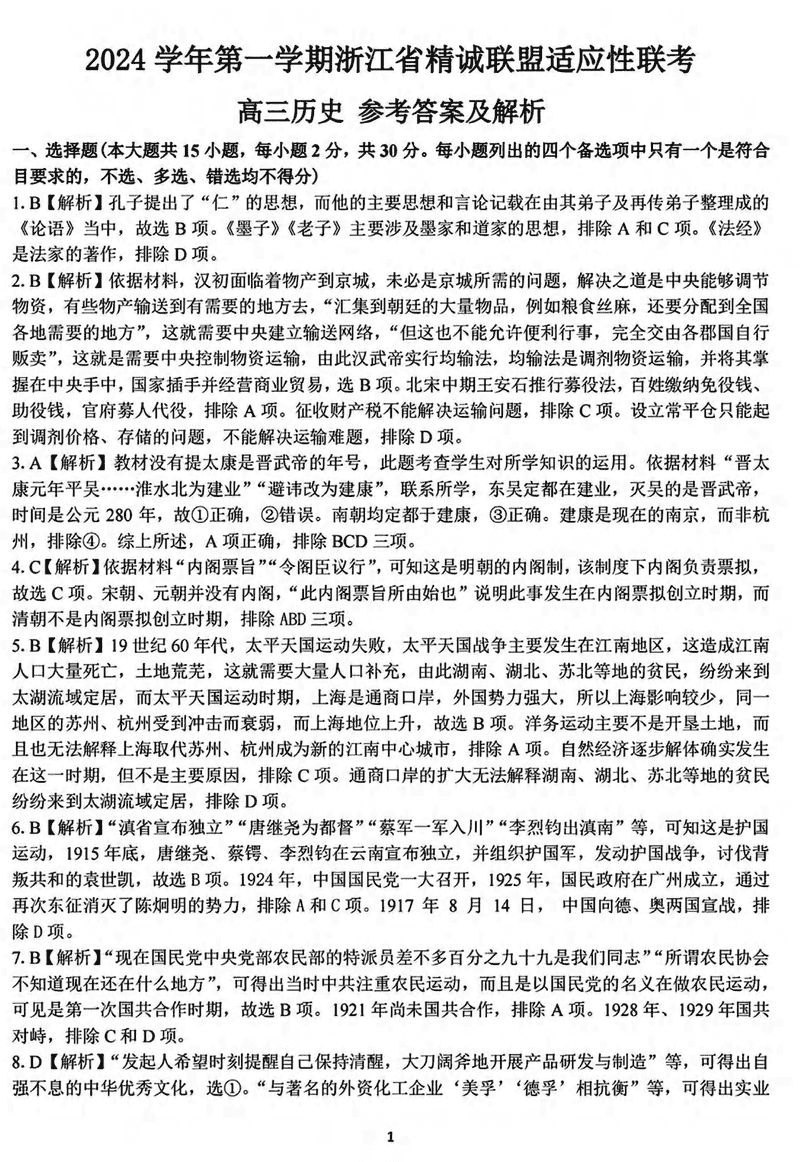 浙江省精诚联盟2024学年12月高三上学期适应性联考历史考试已于近日开考,为方便考生考后及时查看考试情况,查漏补缺、弥补不足,本文整理了试题答案解析相关信息!