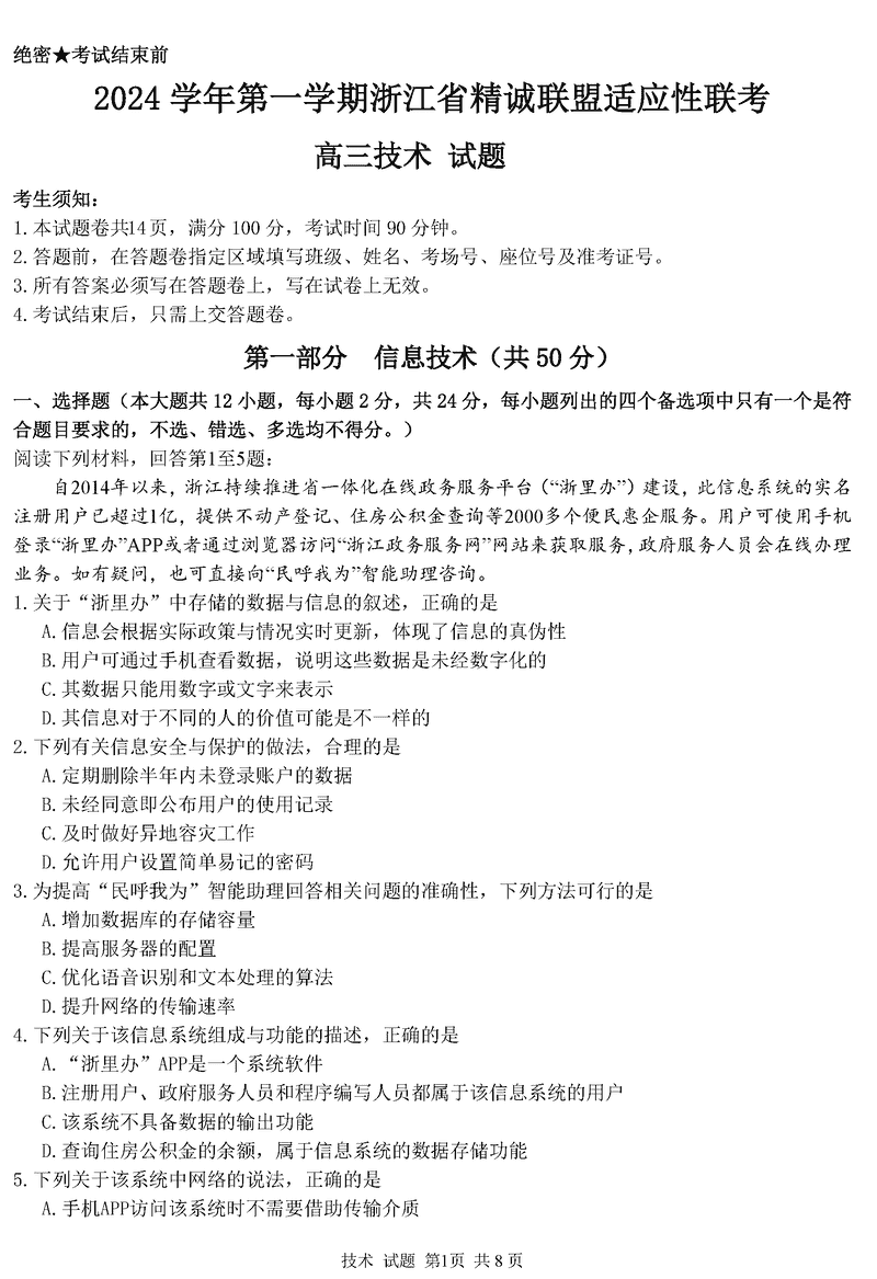 浙江省精诚联盟2024学年12月高三上学期适应性联考技术考试已于近日开考,为方便考生考后及时查看考试情况,查漏补缺、弥补不足,本文整理了试题答案解析相关信息!