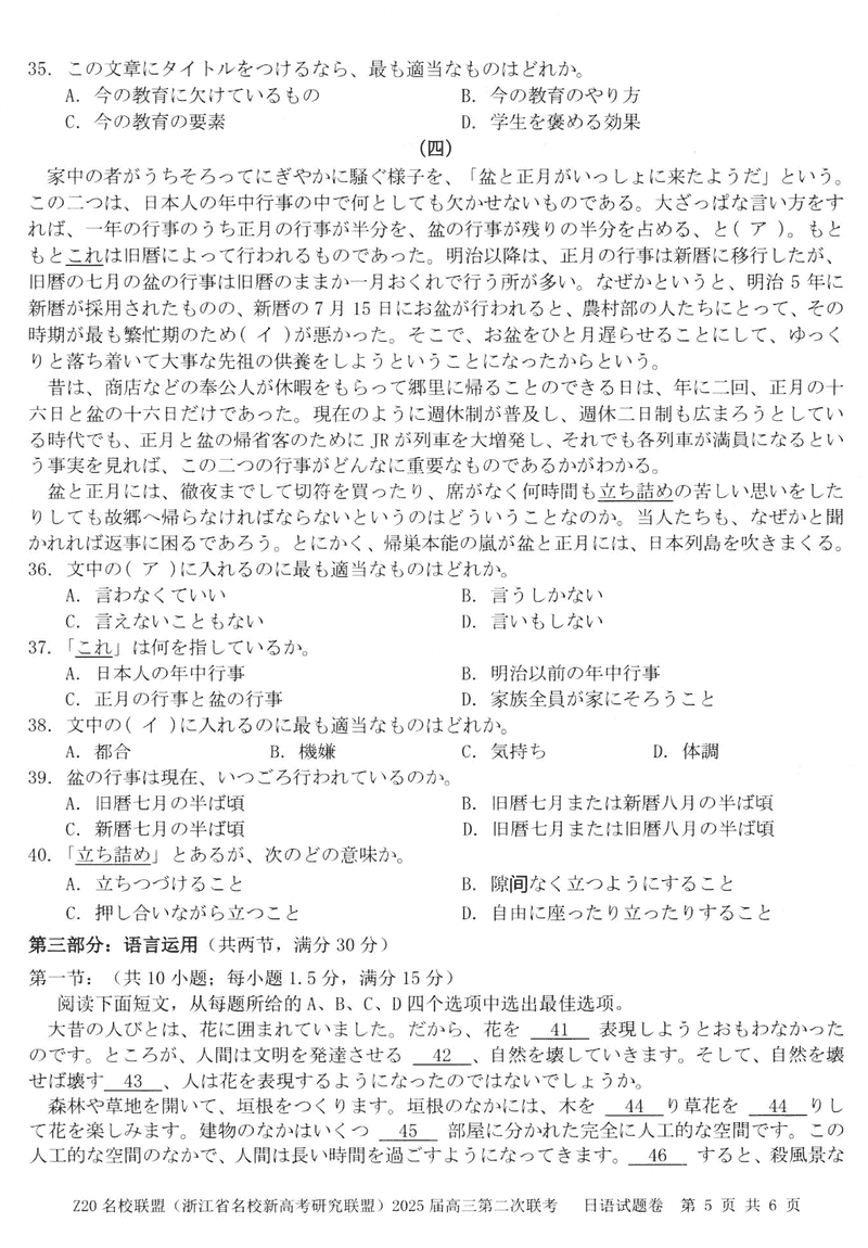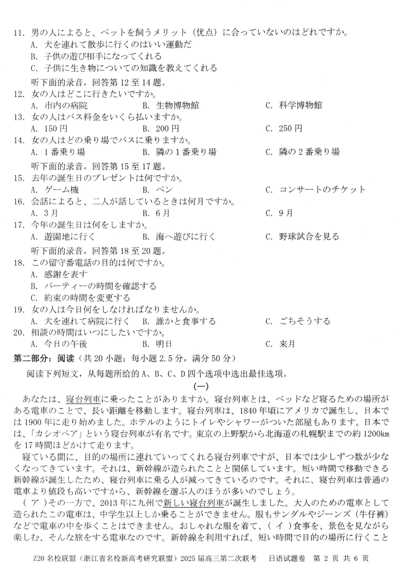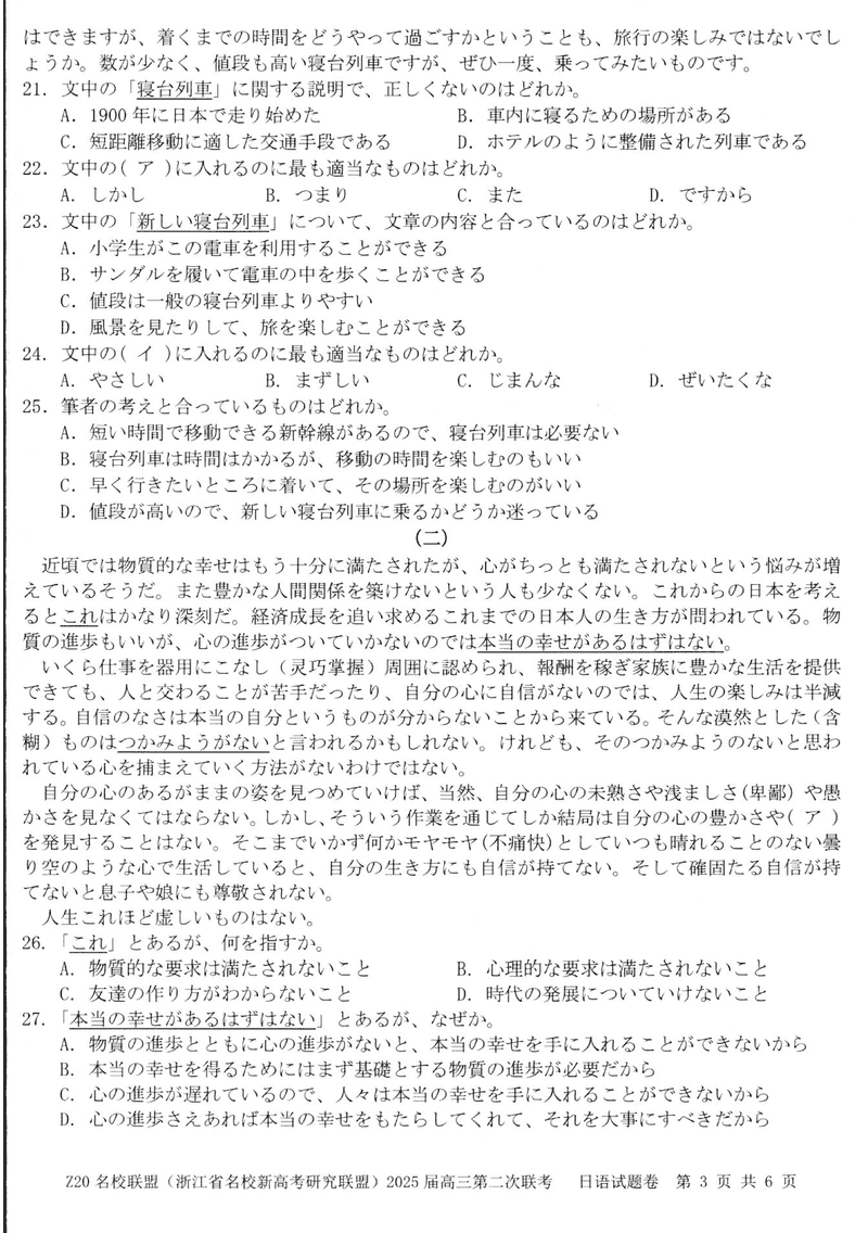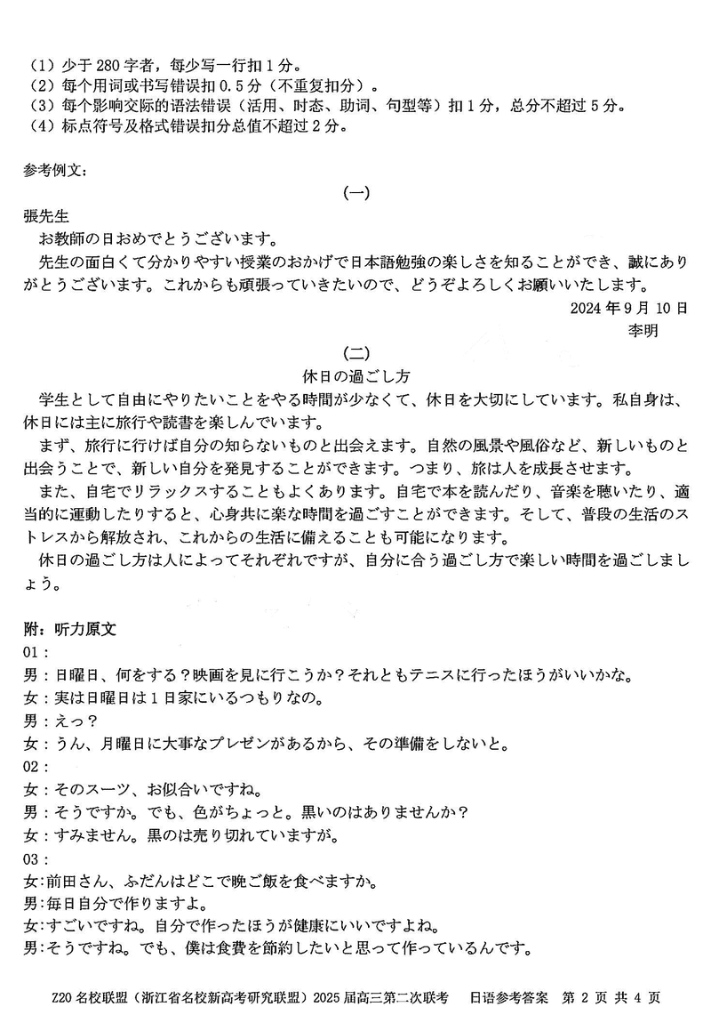 浙江Z20名校联盟2025届高三上学期第二次联考日语试题及答案