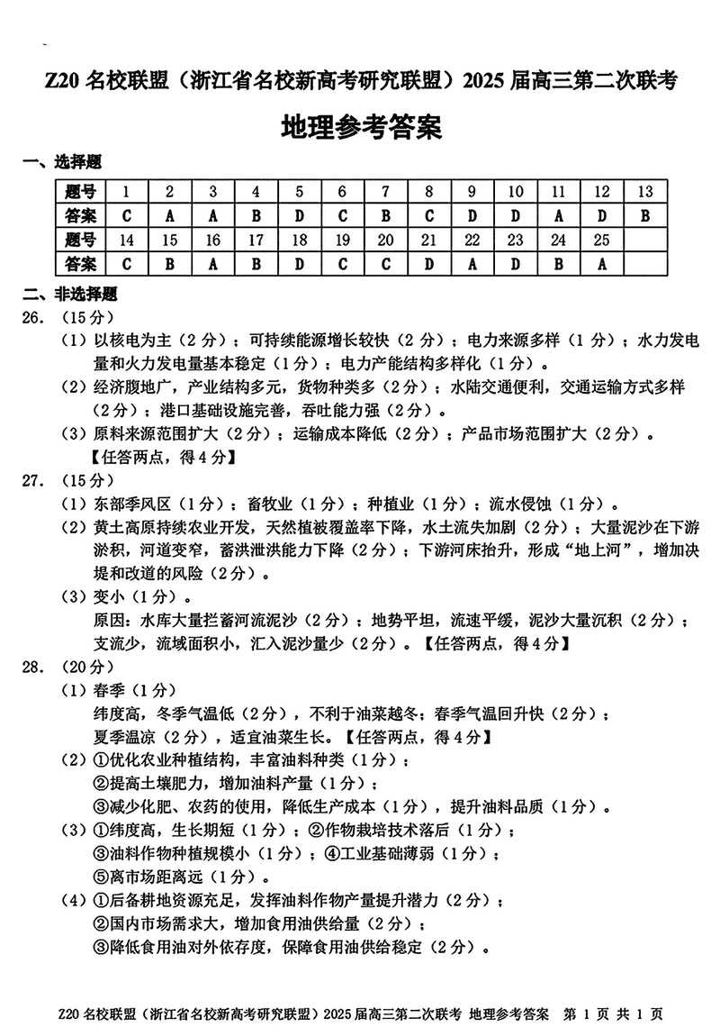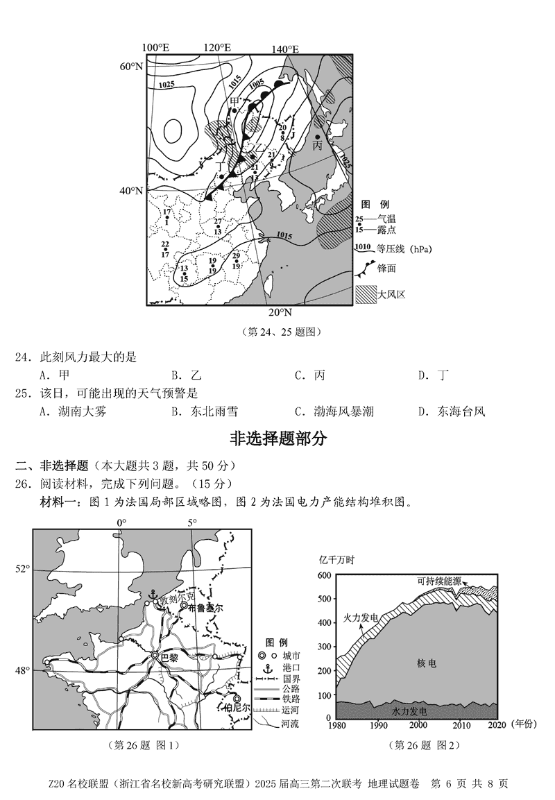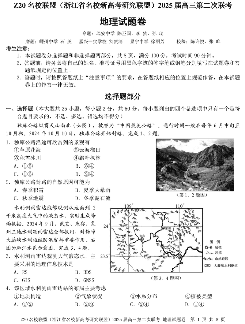浙江Z20名校联盟2025届高三上学期第二次联考地理试题及答案