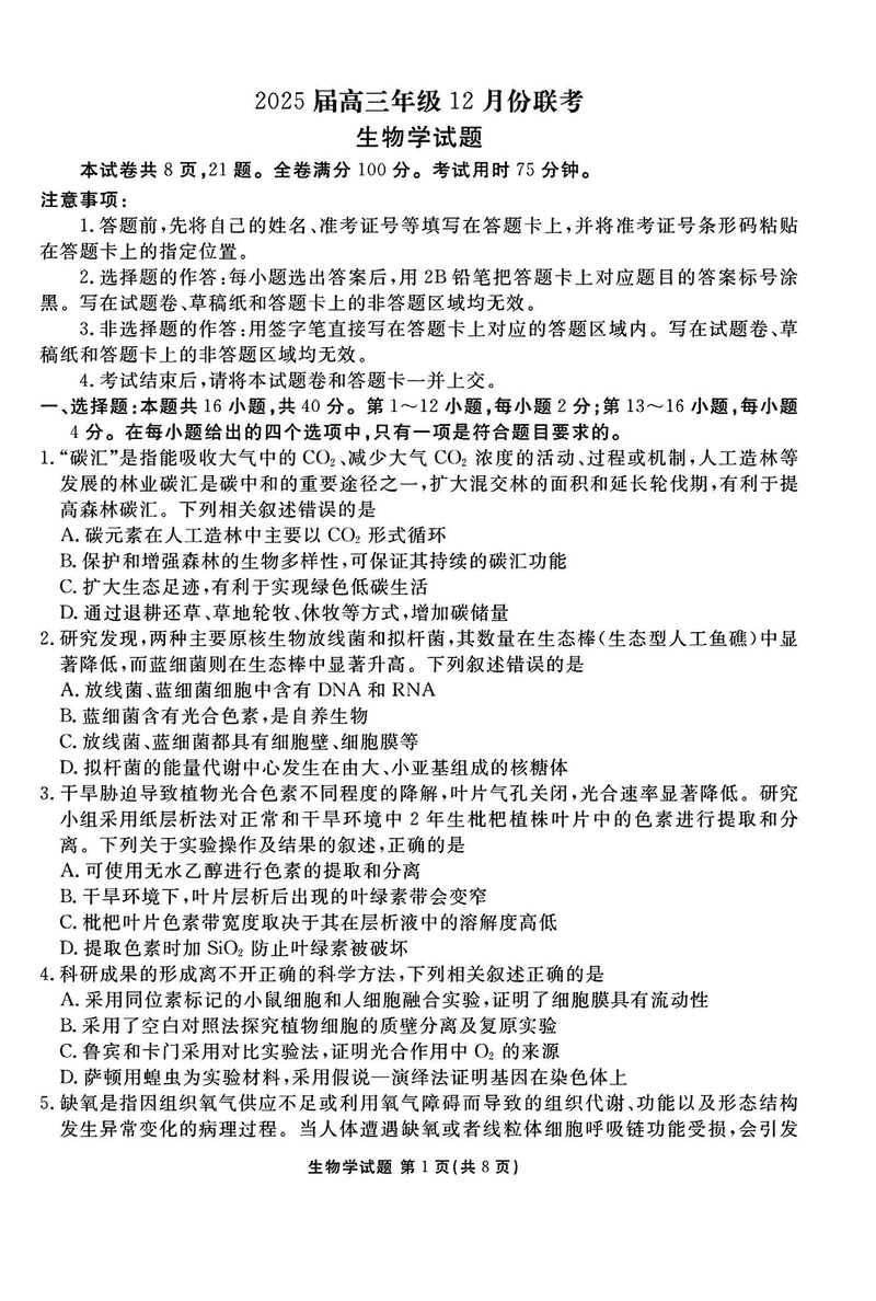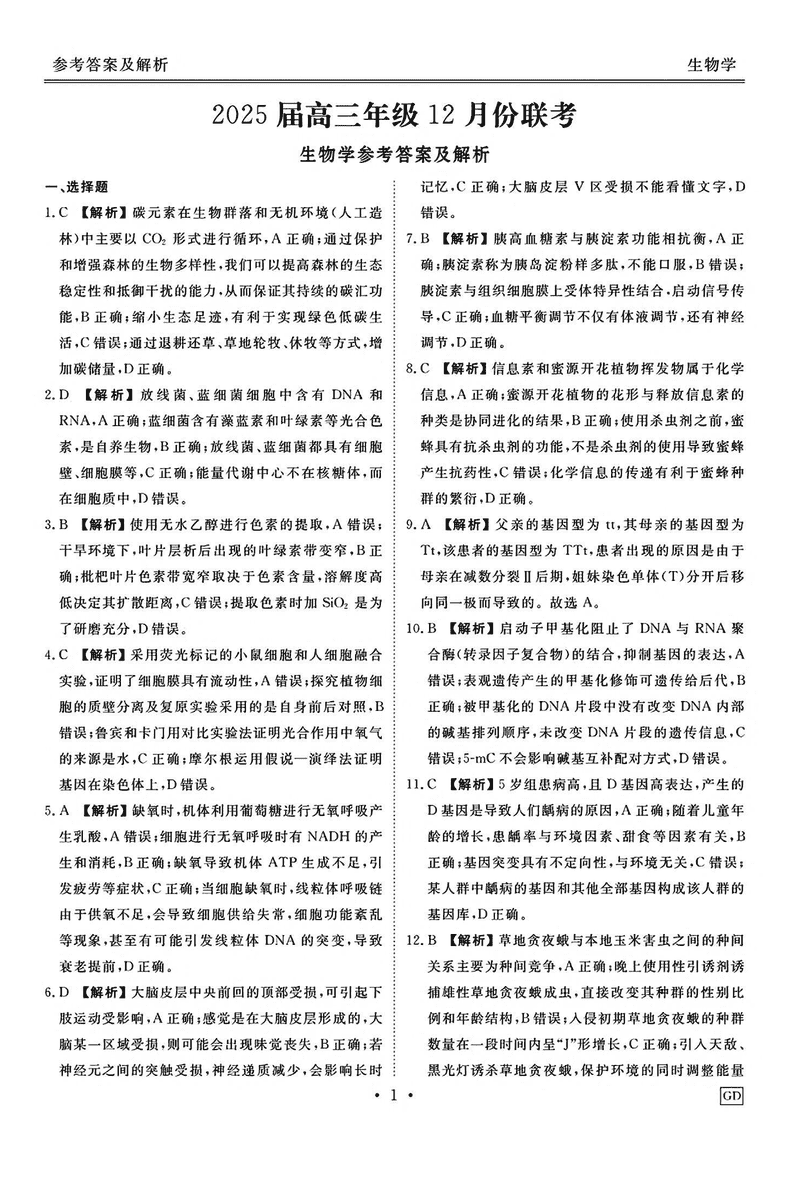 广东衡水金卷2025届高三上学期12月联考生物考试已于近日开考,为方便考生考后及时查看考试情况,查漏补缺、弥补不足,本文整理了试题答案解析相关信息!