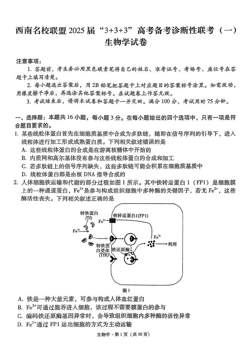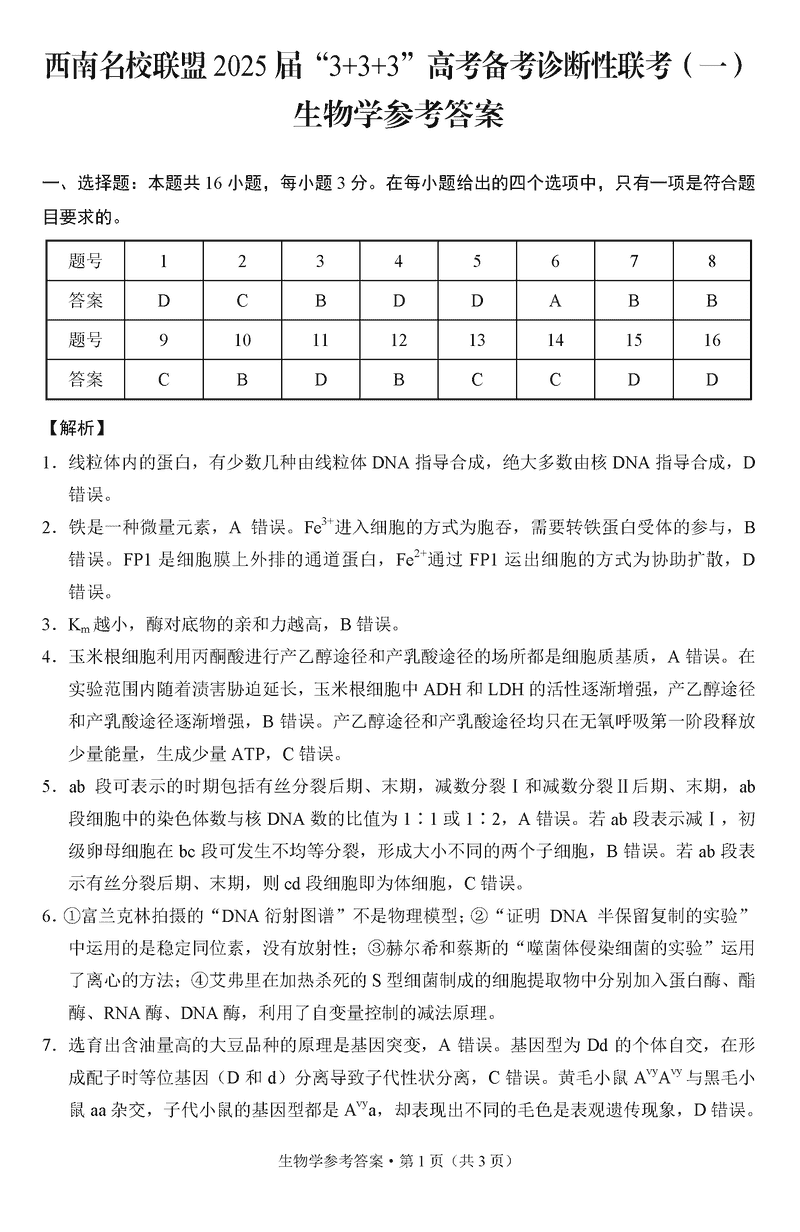 西南名校联盟2025届高三3+3+3诊断性联考(一)生物考试已于近日开考,为方便考生考后及时查看考试情况,查漏补缺、弥补不足,本文整理了试题答案解析相关信息!