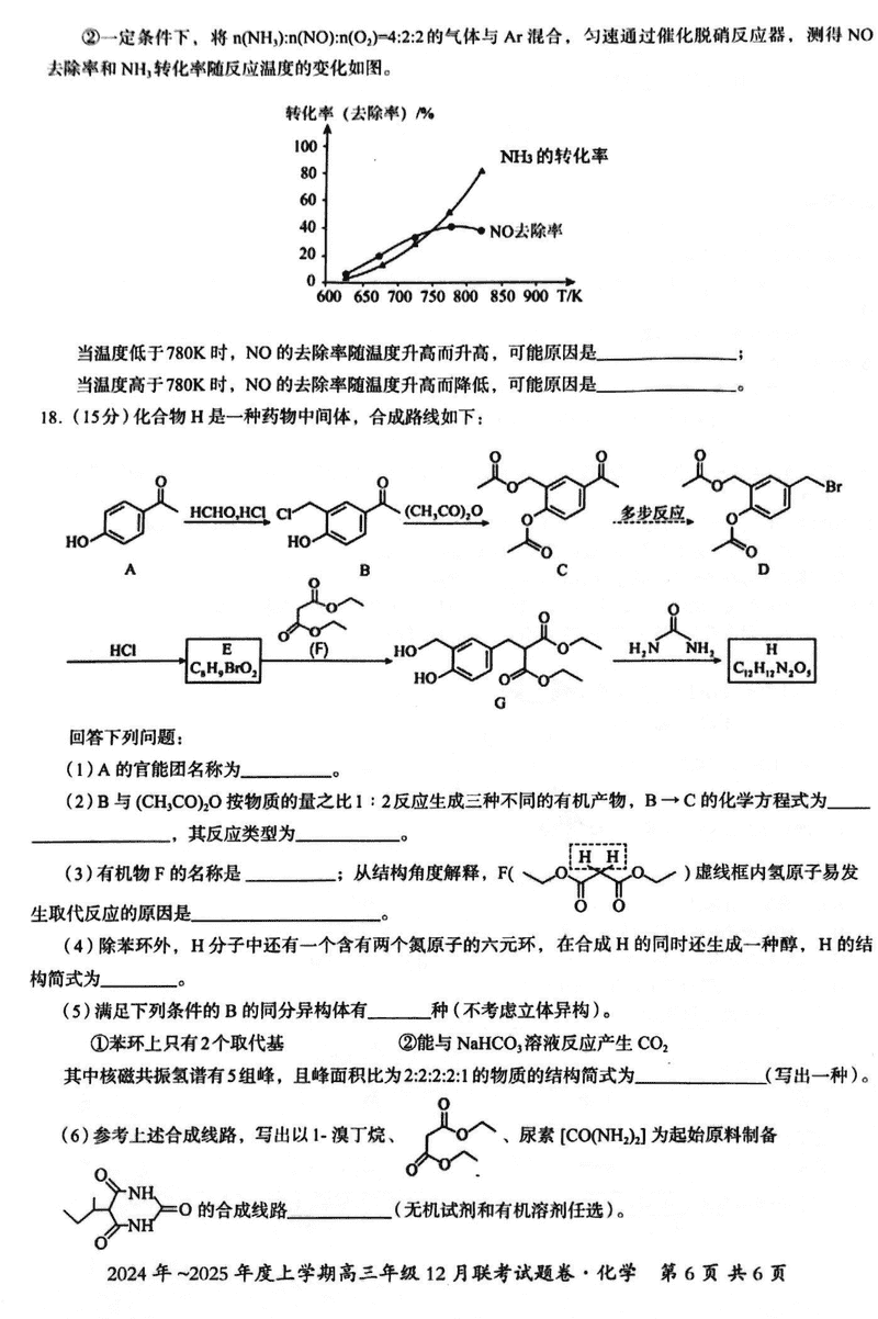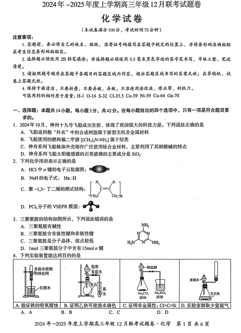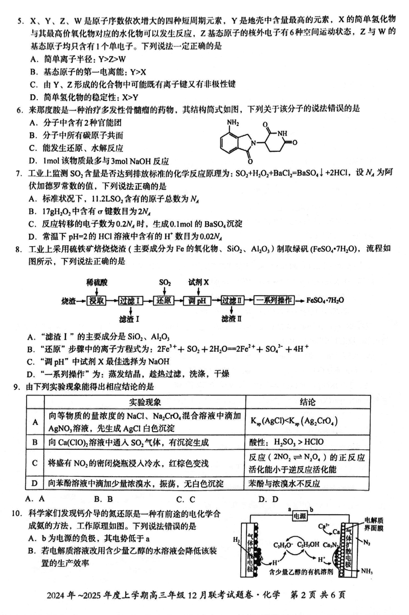 广西邕衡教育名校联盟2025届高三年级12月联考化学试题及答案