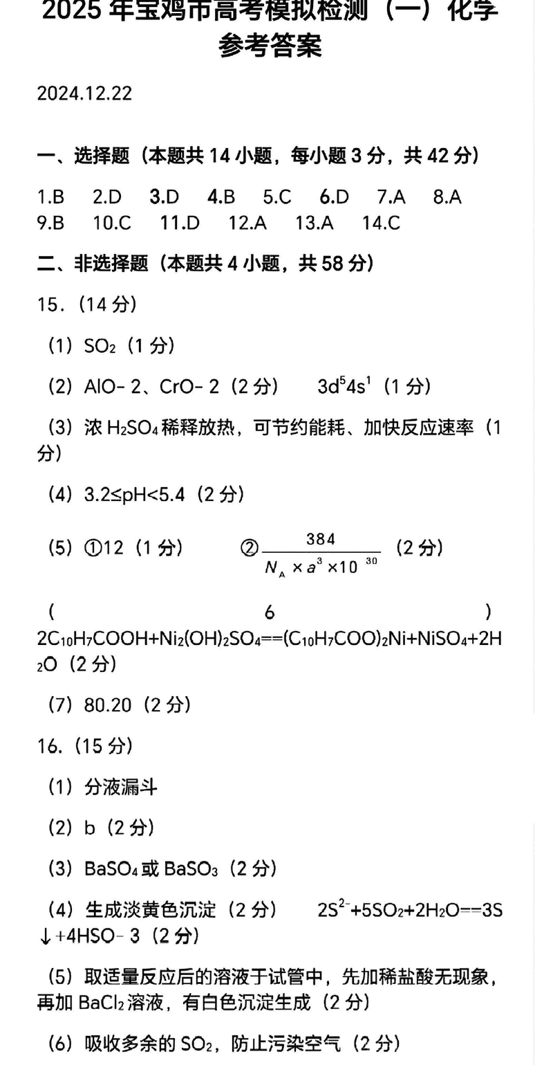 陕西宝鸡2025届高三上学期一模化学试题及答案 时间:2024-12-24 陕西 理综试题 陕西宝鸡2025届高三上学期一模化学考试已于近日开考,为方便考生考后及时查看考试情况,查漏补缺、弥补不足,本文整理了试题答案解析相关信息! 汇总:陕西宝鸡2025届高三上学期一模试题及答案汇总 化学试题及答案解析