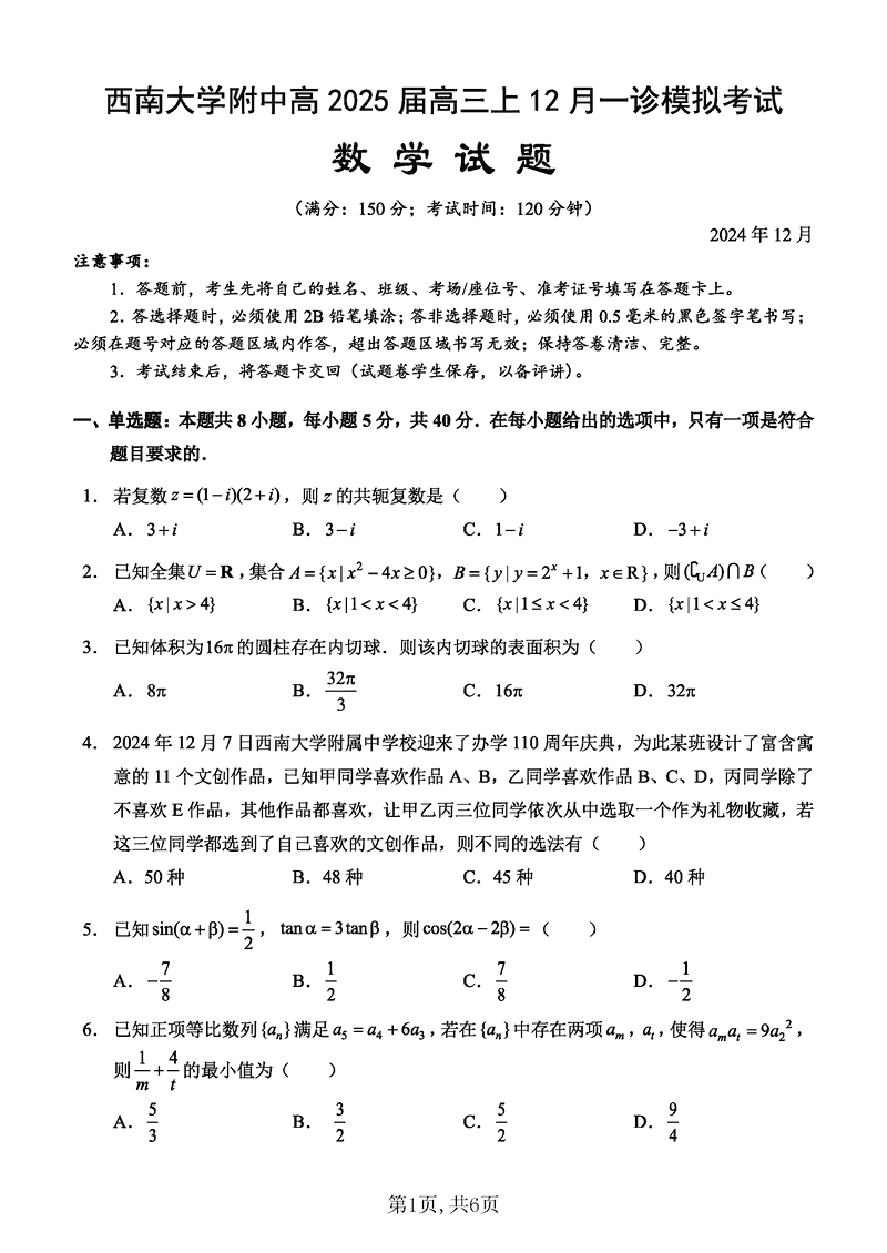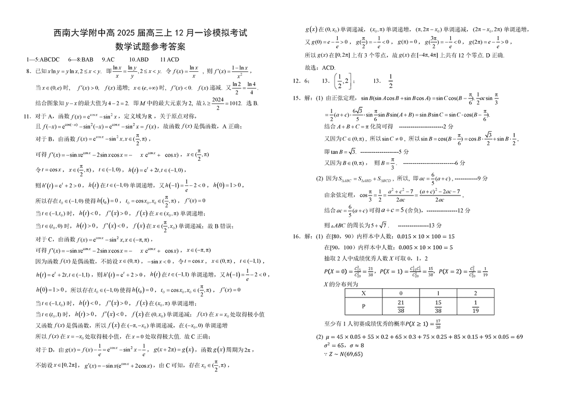 重庆西南大学附中2025届高三12月一诊模拟数学考试已于近日开考,为方便考生考后及时查看考试情况,查漏补缺、弥补不足,本文整理了试题答案解析相关信息!
