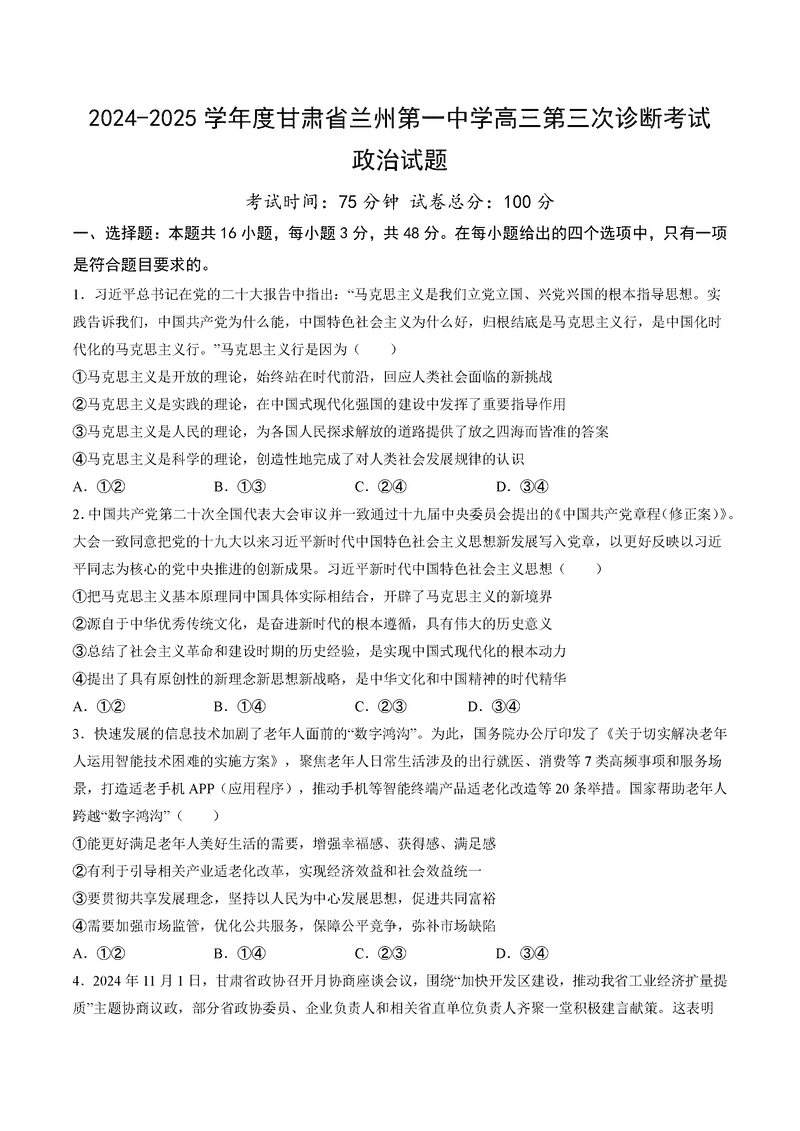 兰州一中2024-2025学年高三上第三次诊断政治试题及答案