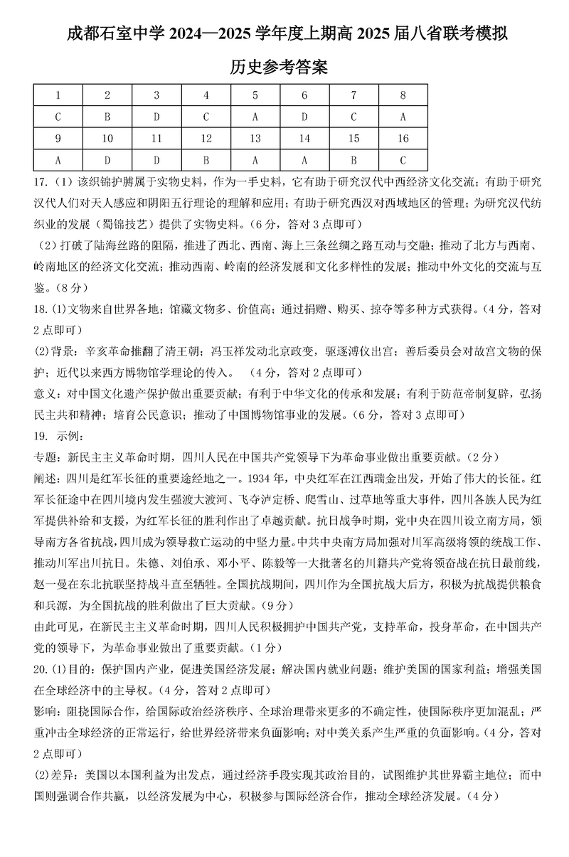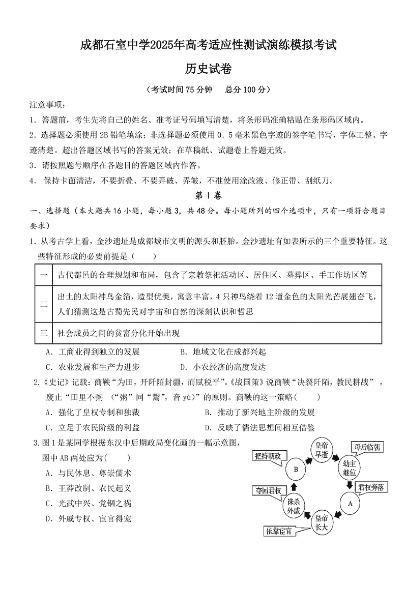 成都石室中学2025年高考适应性测试演练八省联考模拟历史考试已于近日开考,为方便考生考后及时查看考试情况,查漏补缺、弥补不足,本文整理了试题答案解析相关信息!