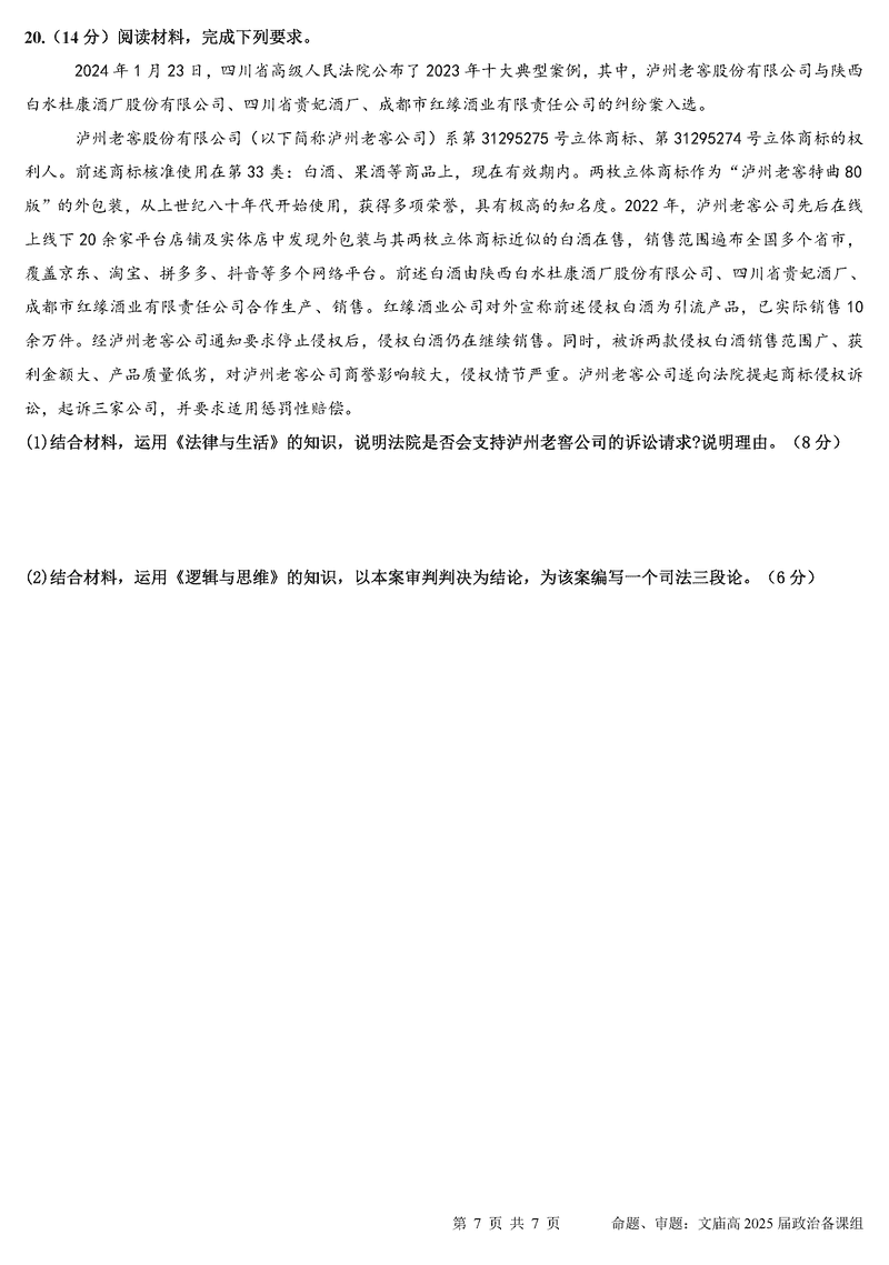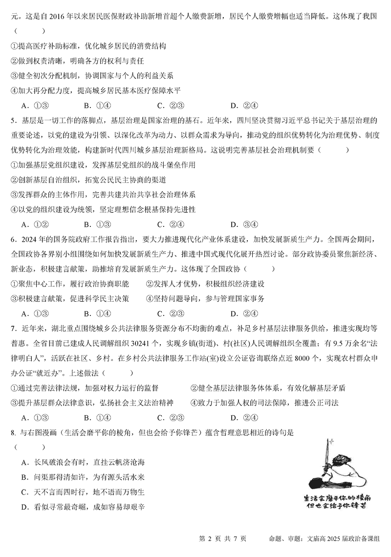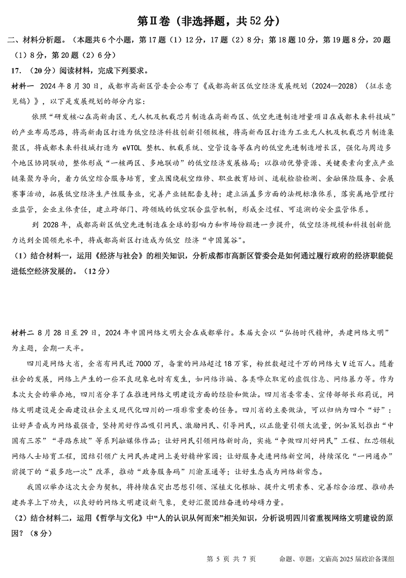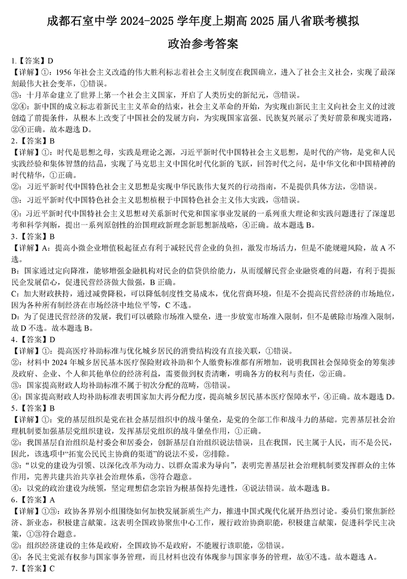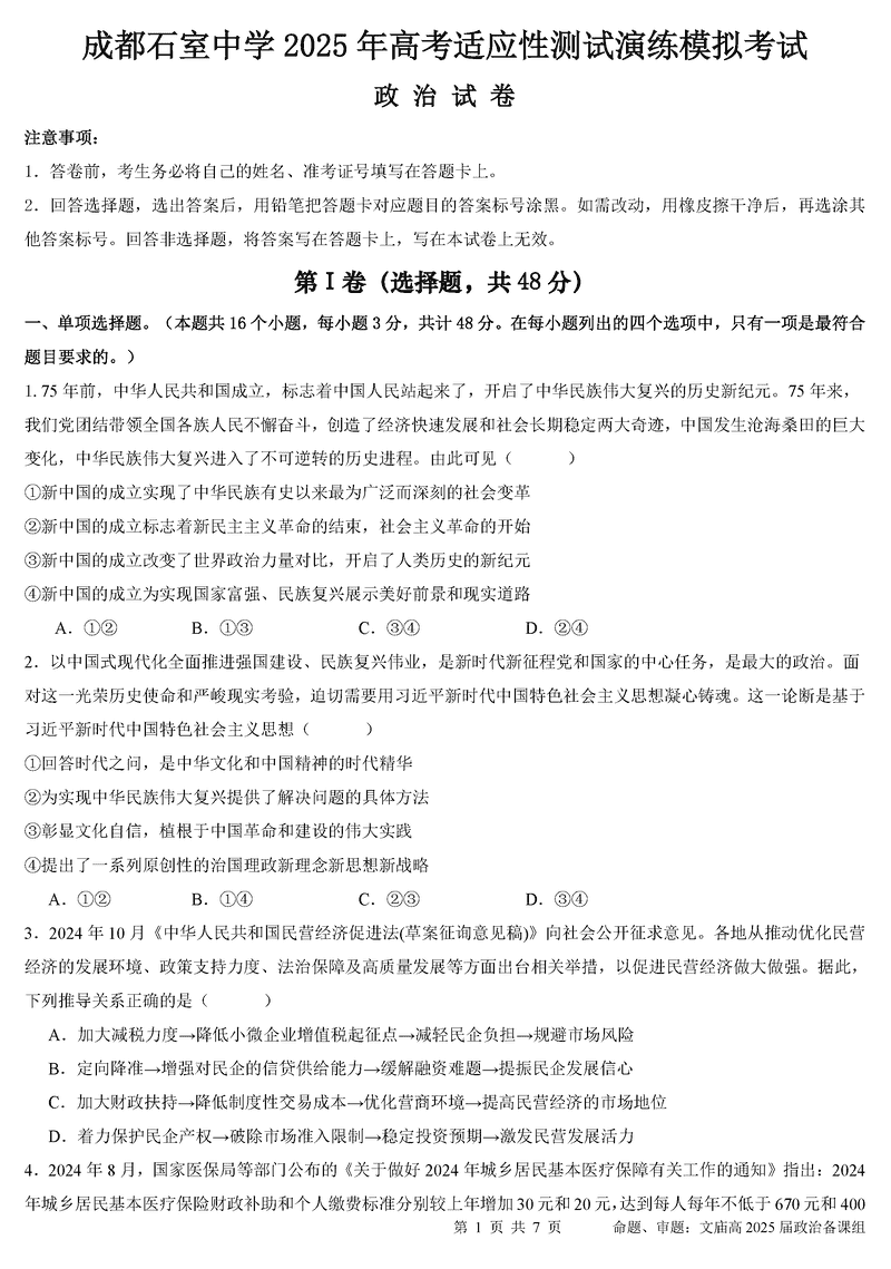 成都石室中学2025年高考适应性测试演练八省联考模拟政治考试已于近日开考,为方便考生考后及时查看考试情况,查漏补缺、弥补不足,本文整理了试题答案解析相关信息!
