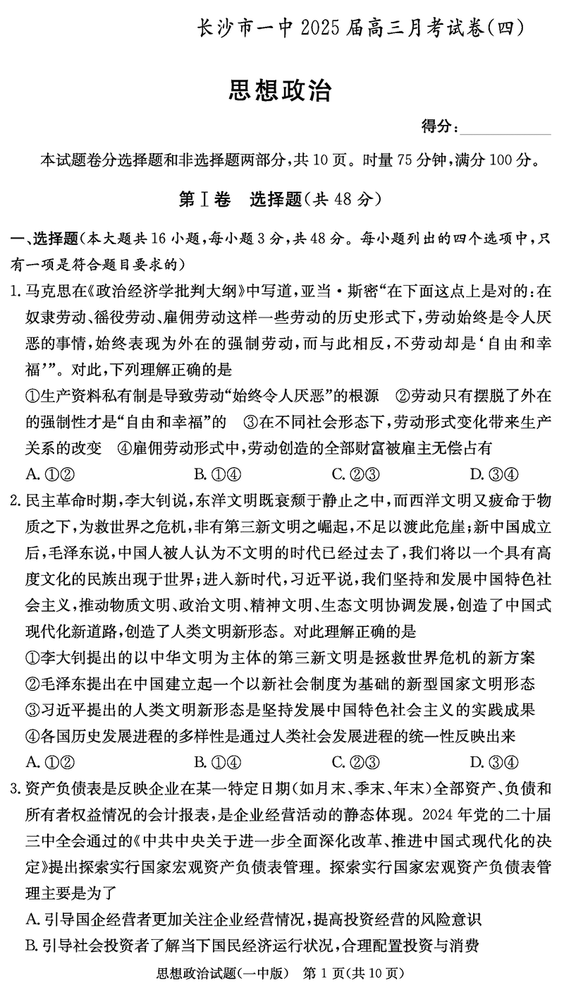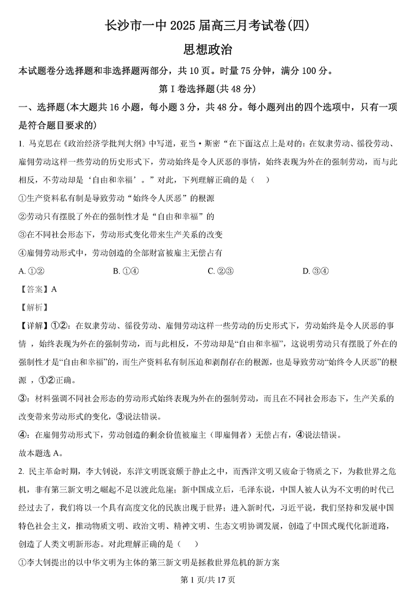 长沙市一中2025届高三月考试卷(四)政治试题及答案 时间:2024-12-30 湖南 文综试题 长沙市一中2025届高三月考试卷(四)政治考试已于近日开考,为方便考生考后及时查看考试情况,查漏补缺、弥补不足,本文整理了试题答案解析相关信息! 汇总:长沙市一中2025届高三月考试卷(四)试题及答案汇总 政治试题及答案解析