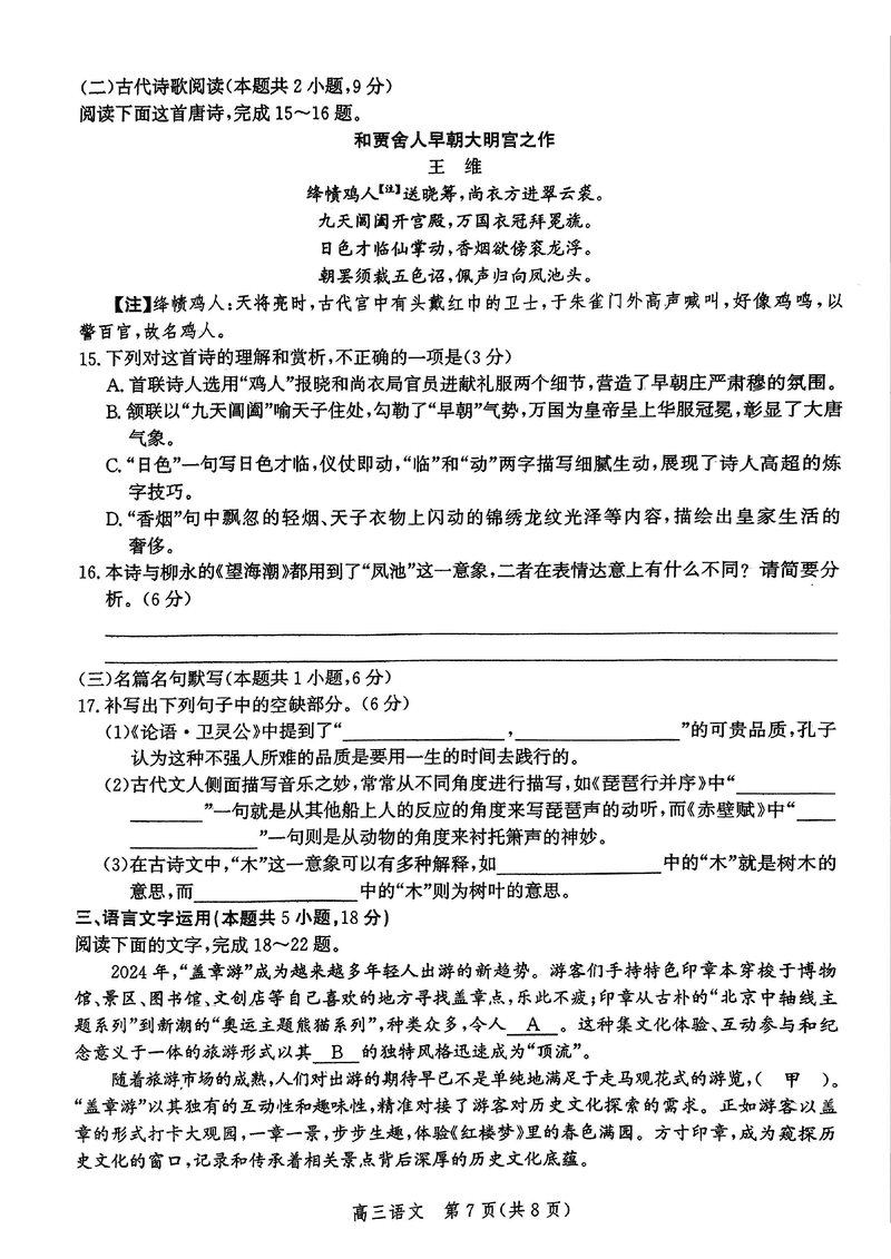 河北邯郸2025届高三上学期第二次调研监测语文试题及答案