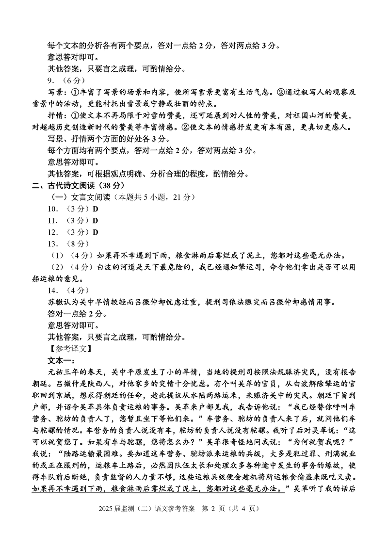 福建泉州2025届高中毕业班质量监测(二)语文试题及答案