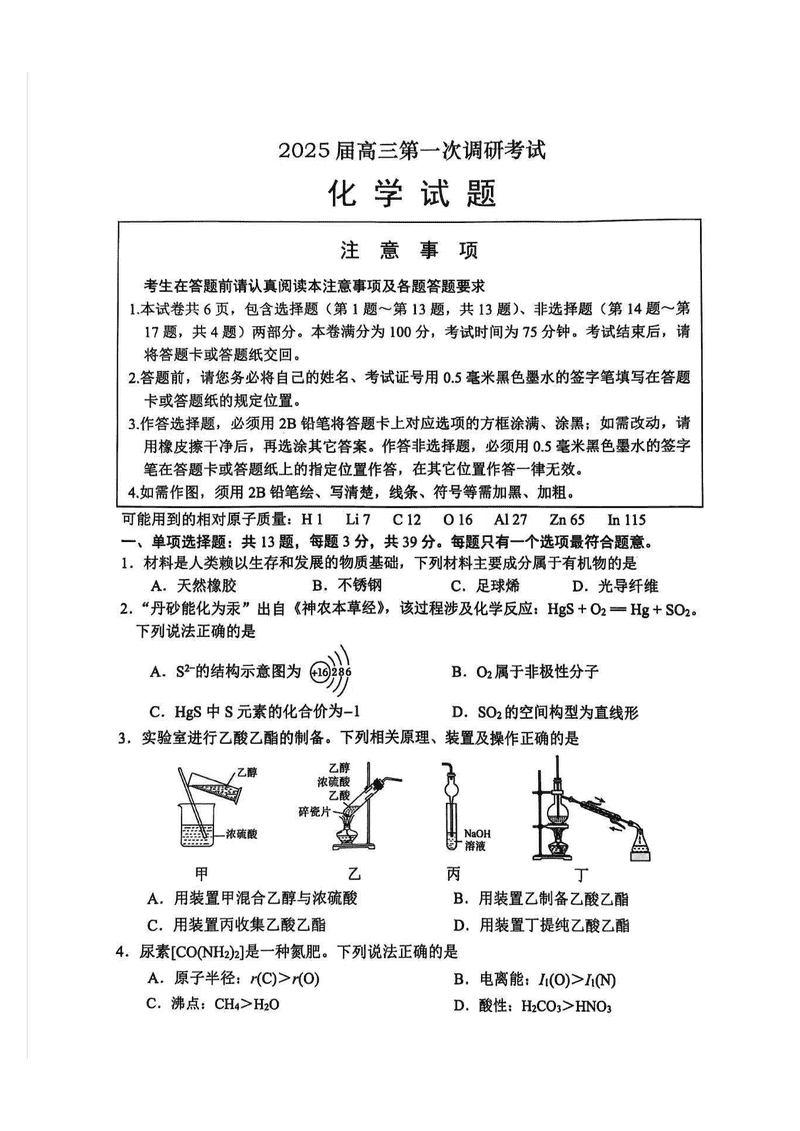 江苏南通2025年高三上学期一模化学试题及答案 时间:2025-01-20 江苏 理综试题 江苏南通2025年高三上学期一模化学考试已于近日开考,为方便考生考后及时查看考试情况,查漏补缺、弥补不足,本文整理了试题答案解析相关信息! 汇总:江苏南通2025年高三上学期一模试题及答案汇总 化学试题及答案解析