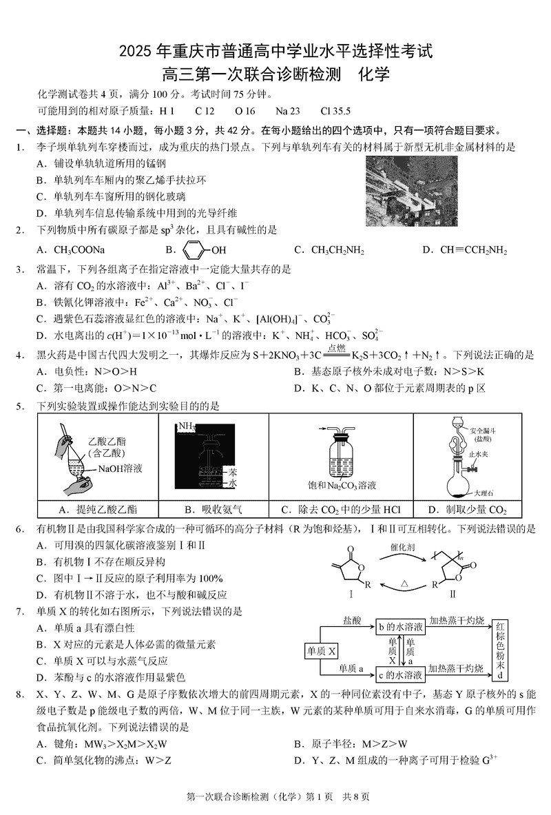重庆市2025年康德一诊化学试题及答案 时间:2025-01-20 重庆 理综试题 重庆市2025年康德一诊化学考试已于近日开考,为方便考生考后及时查看考试情况,查漏补缺、弥补不足,本文整理了试题答案解析相关信息! 汇总:重庆市2025年康德一诊试题及答案汇总 化学试题及答案解析