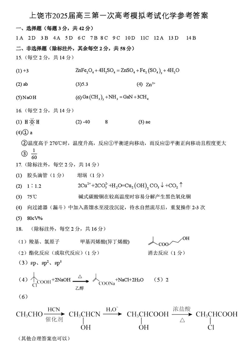 江西上饶2025届高三第一次高考模考化学考试已于近日开考,为方便考生考后及时查看考试情况,查漏补缺、弥补不足,本文整理了试题答案解析相关信息!
