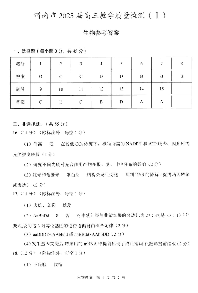 陕西渭南2025届高三上学期教学质量检测Ⅰ生物考试已于近日开考,为方便考生考后及时查看考试情况,查漏补缺、弥补不足,本文整理了试题答案解析相关信息!