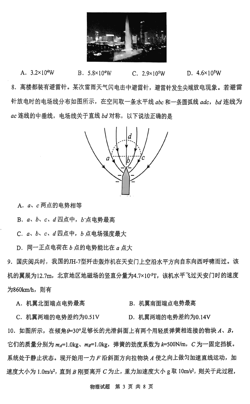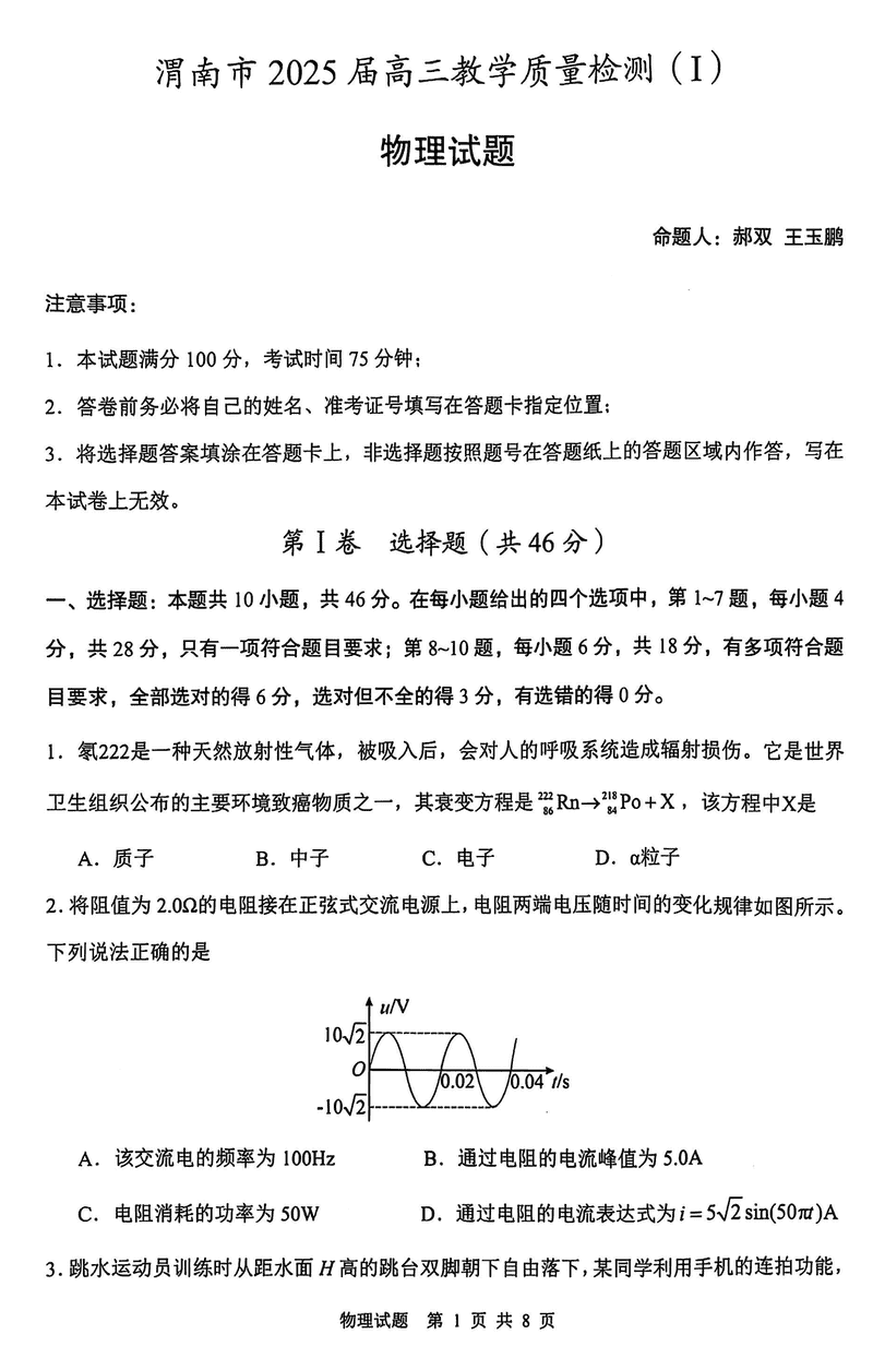 陕西渭南2025届高三上学期教学质量检测Ⅰ物理试题及答案