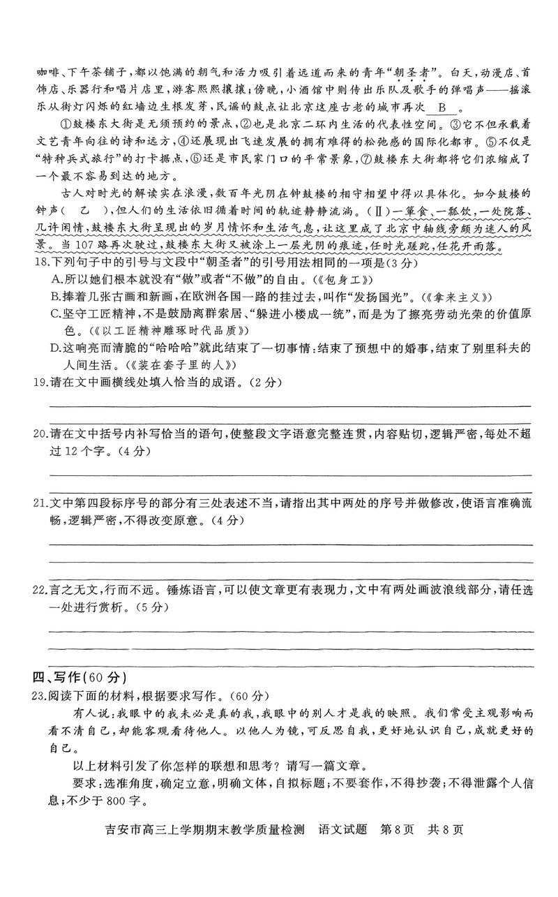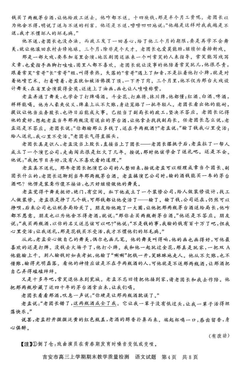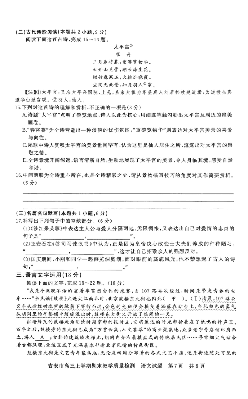 江西吉安2025届高三上1月期末教学质检语文试题及答案