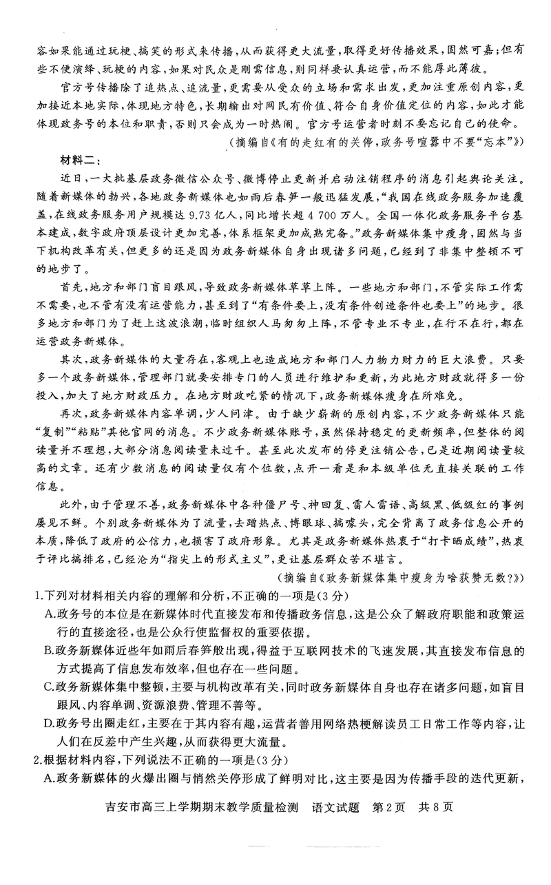 江西吉安2025届高三上1月期末教学质检语文考试已于近日开考,为方便考生考后及时查看考试情况,查漏补缺、弥补不足,本文整理了试题答案解析相关信息!