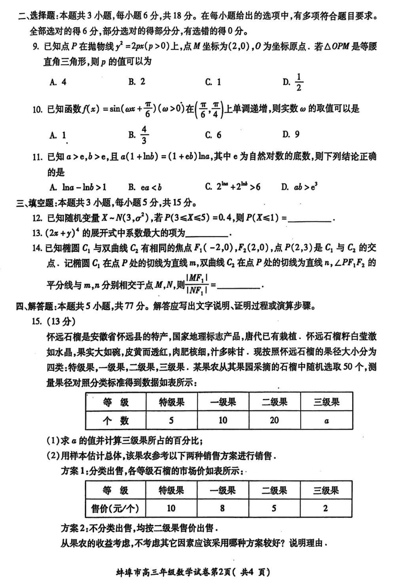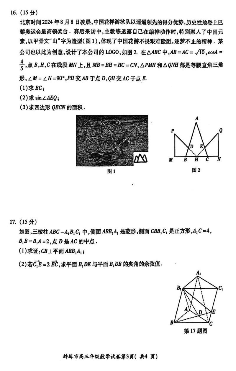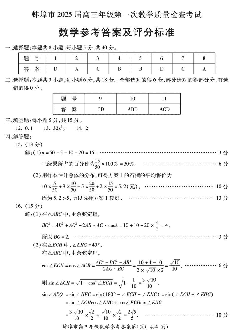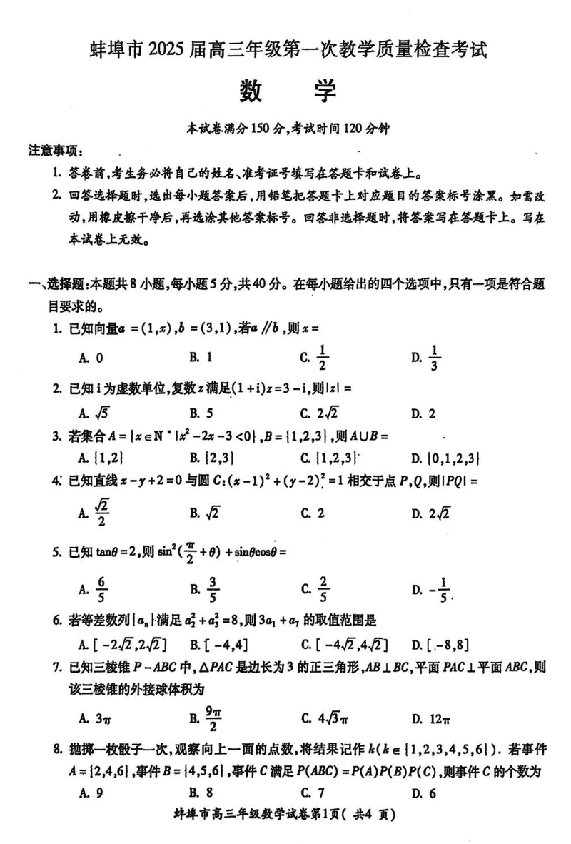 安徽蚌埠2025届高三上学期1月第一次教学质量检查数学考试已于近日开考,为方便考生考后及时查看考试情况,查漏补缺、弥补不足,本文整理了试题答案解析相关信息!