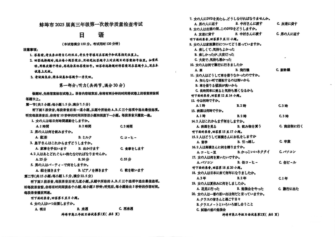 安徽蚌埠2025届高三上学期1月第一次教学质量检查日语试题及答案