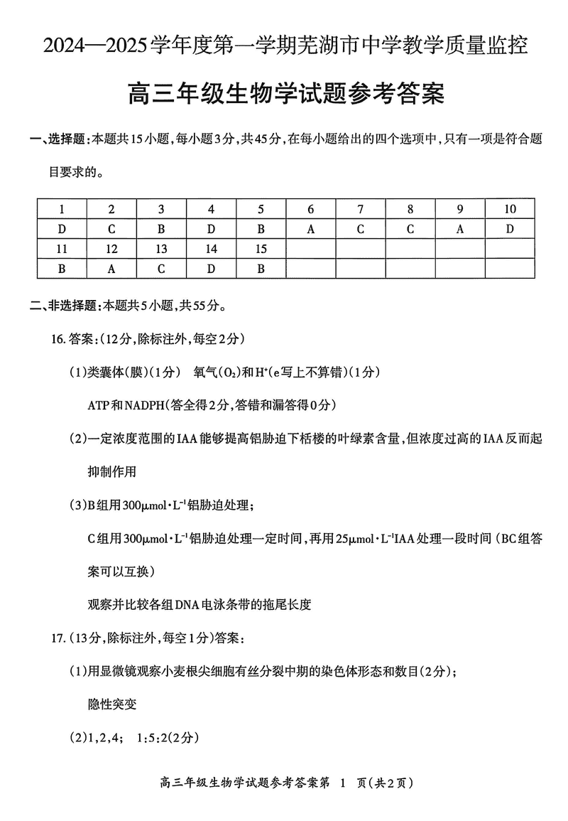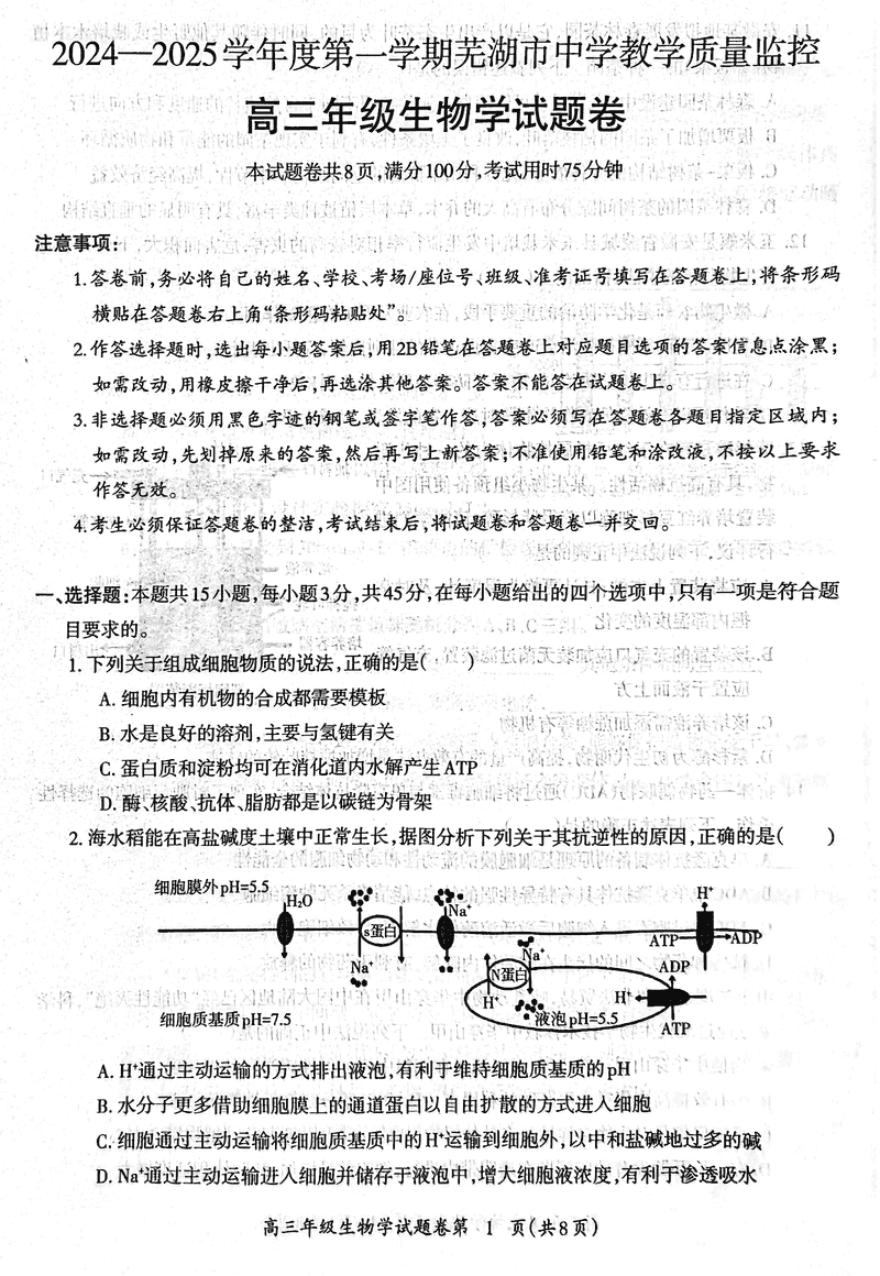 安徽芜湖2025届高三上学期1月期末生物试题及答案 时间:2025-01-27 安徽 理综试题 安徽芜湖2025届高三上学期1月期末生物考试已于近日开考,为方便考生考后及时查看考试情况,查漏补缺、弥补不足,本文整理了试题答案解析相关信息! 汇总:安徽芜湖2025届高三上学期1月期末试题及答案汇总 生物试题及答案解析
